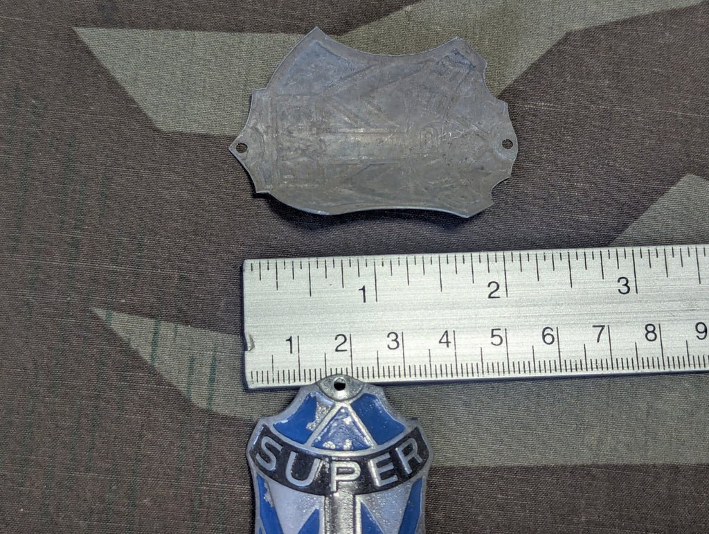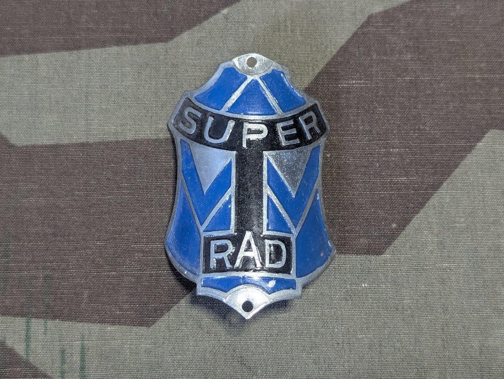 Vintage German 'Super Rad' bicycle badge.Radjust means 'bicycle' in German but it makes for an amusing brand name.Price is for one.All have some flaking on the blue paint. Chances are more paint may flake off on its way to you. Otherwise, decent shape. I am unsure the date on these.