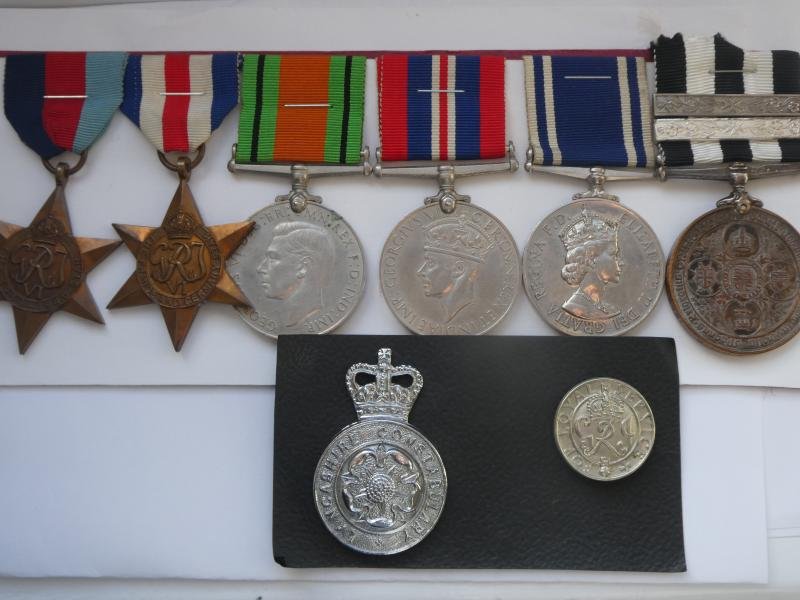 1939/45 Star, France and Germany Star,Defence and War Medals, Police Long Service Medal, named to:SERGT ARTHUR TODDService Medal of The Order Of St John, plated issue with two extra service clasps, named to:PTE.A.TODD LANCS S.J.A.B.1955Medal stapled to card as purchased, also comes with a Lancashire Constabulary cap badge and badge for Loyal Service