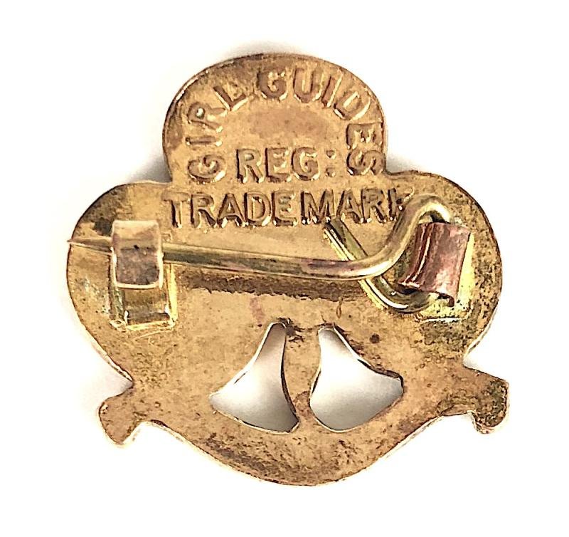 A scarce original circa 1965 period 'Girl Guides Rangers promise badge', gilt brass trefoil inlaid with royal blue enamel, the reverse impressed in relief 'Girl Guides Reg: Trade Mark'. Very good condition, complete with original pin fittings, no defects to the enamel.Height approx 21mm.