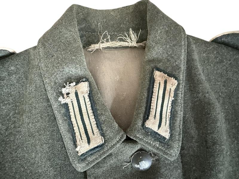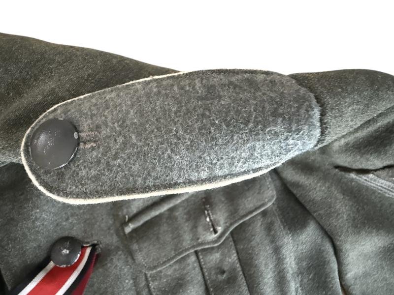 A fantastic combat used WH (Heer) M40 Field Blouse. The tunic is applied with original insiginia and shows some clear age and wear. This clearly adds to the patina of this tunic! The tunic is applied with a Stabsgefreiter chevron and M1936 breast eagle. Original collar tabs and Infantry (white truppenfarbe). The tunic is also applied with 2nd Class Iron Cross and Ostmedaile (East medal) ribbon. Fitted with black loops on the breast pocket for an abzeichen. The tunic is not visibly makers marked or sized, yet compromises a decent mannequin size. This is a truly nice combat used Wehrmacht M40 Field Blouse with true age and history. Therefore would be hard to upgrade.