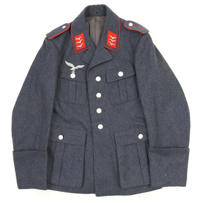 Very nice high quality issue blue/grey wool construction 1935 pattern Luftwaffe four-pocket tunic (Waffenrock) as intended for an 'Obergefreiter der Flakartillerie'. The tunic features a vertical, four button, front closure. The right breast has a very nice quality standard machine-embroidered Luftwaffe breast-eagle neatly hand-stitched to the tunic. A pair of red-coloured collar tabs, both having three rank-gulls attached, is nicely machine sewn to the collar. The collar is surrounded by a red piping. The tunic is complete with a pair of slip-on type shoulder-boards having the red 'Waffenfarbe' indicating an Obergefreiter within a 'FLAK' unit. The interior of the tunic is lined in grey cotton. The tunic is nicely size marked and maker marked by the company of 'Veit Groh & Sohn' from Karlsruhe and is dated 1939. The tunic is in overall very good near mint condition, there are some minor traces of usage, see photos. Stunning original Luftwaffe four-pocket FLAK tunic!