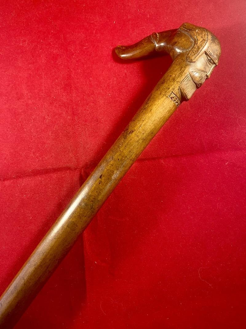 Antique Olive Wood Greek KEPKYPA (Corfu) Walking Stick with Carved Grip Depicting an Elephant's Head and a Bearded Man's Head