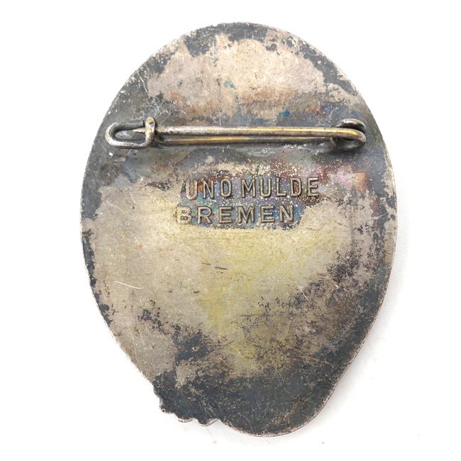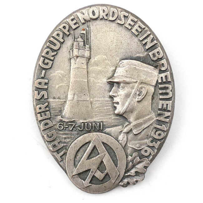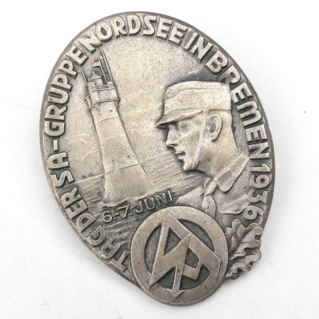 'Tag der SA-Gruppe Nordsee in Bremen' 1936 Tinnie (Veranstaltungsabzeichen) intended for an SA gathering held on 6-7 June 1936. The large sized massive cupal type tinnie is complete with functional pin-back system. The tinnie is maker marked by 'Bruno Mulde' from Bremen. Decorative original tinnie!