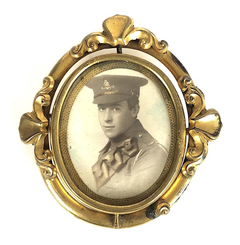 A unique original First World War mothers orloved one sentimental ornate pin sweetheart brooch' in the form of gilt brass glass framed portrait photograph of a Royal Artillery gunner in khaki uniform, displaying 1903 pattern leather bandolier equipment; the reverse wth an artistically hand carved bone floral and bird scene. Good condition, images remains clear.Height approx 52mm.