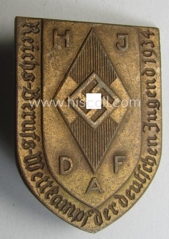Commemorative, golden-bronze-toned, 'DAF'/'HJ'- (ie. 'Deutsches Arbeits Front o. Hitlerjugend'-) related 'tinnie' being a maker- (ie. 'Reichsverband 58 Pforzheim'-): 'Reichs-Berufs-Wettkampf der deutschen Jugend 1935'