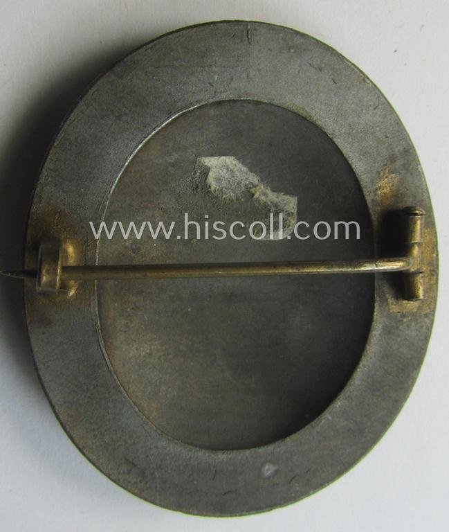 This is a very attractive - and with certainty scarcely encountered! - zinc- (ie. 'Feinzink'-) based, greyish-toned so-called: 'Reichsnährstand'- (ie. 'RNSt.'-) related commemorative loyal-service brooch ('Brosche') being a non-maker- example showing the (Runic-styled!) text that reads: 'Reichsnährstand - Landesbauernschaft Bayern - für 20 Jahre Treue Dienste' and that comes in an overall nice- (albeit issued- ie. worn-), condition. The unusually oval-shaped piece is executed in greyish-coloured- (and I deem molded, zinc- ie. 'Feinzink'-based) metal: it shows some normal wear and/or moderate age but has apparently never been cleaned nor polished (it is still a bit dirty but has maintained a nice, somewhat tarnished, age-patina). The badge comes mounted onto its functional (and just unaltered!) pin-/catch set-up and shows some minimal age ie. staining (as can be seen on the pictures). Simply a nice occasion to acquire a: 'Reichsnährstand'- (ie. 'RNSt.'-) related so-called: loyal-service brooch ('Brosche') for an interesting and I deem justified price!