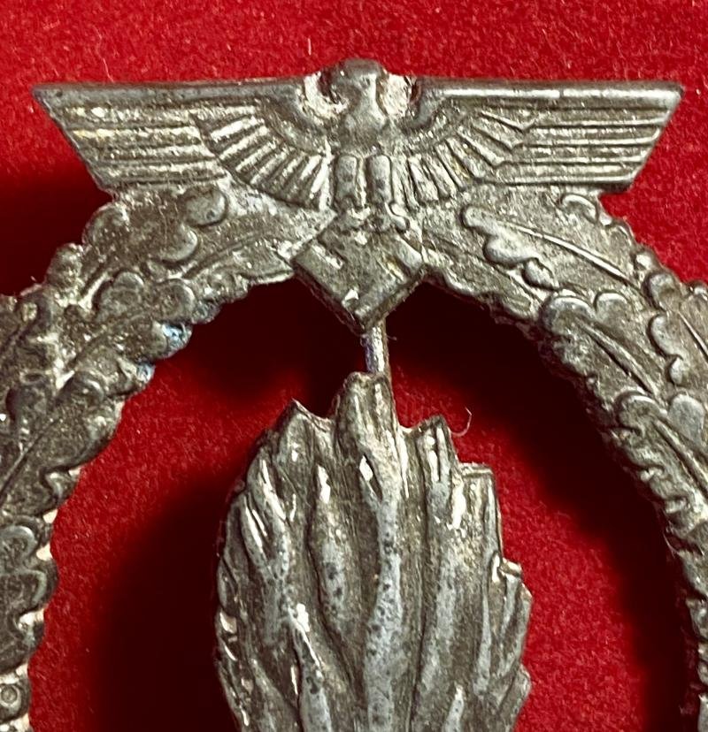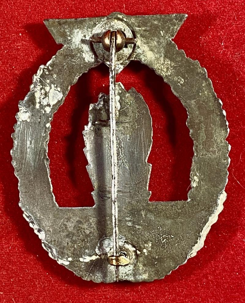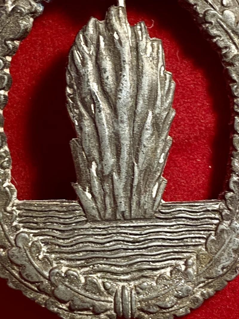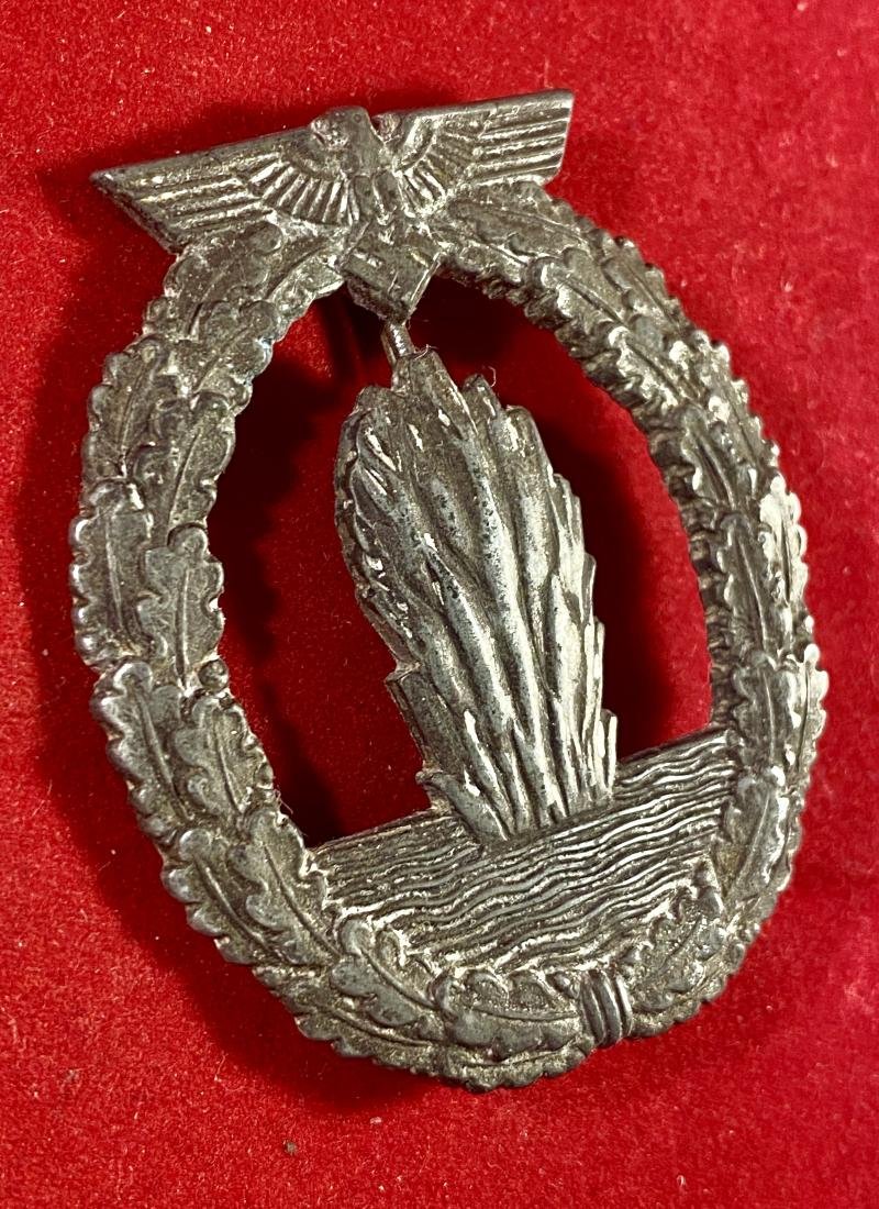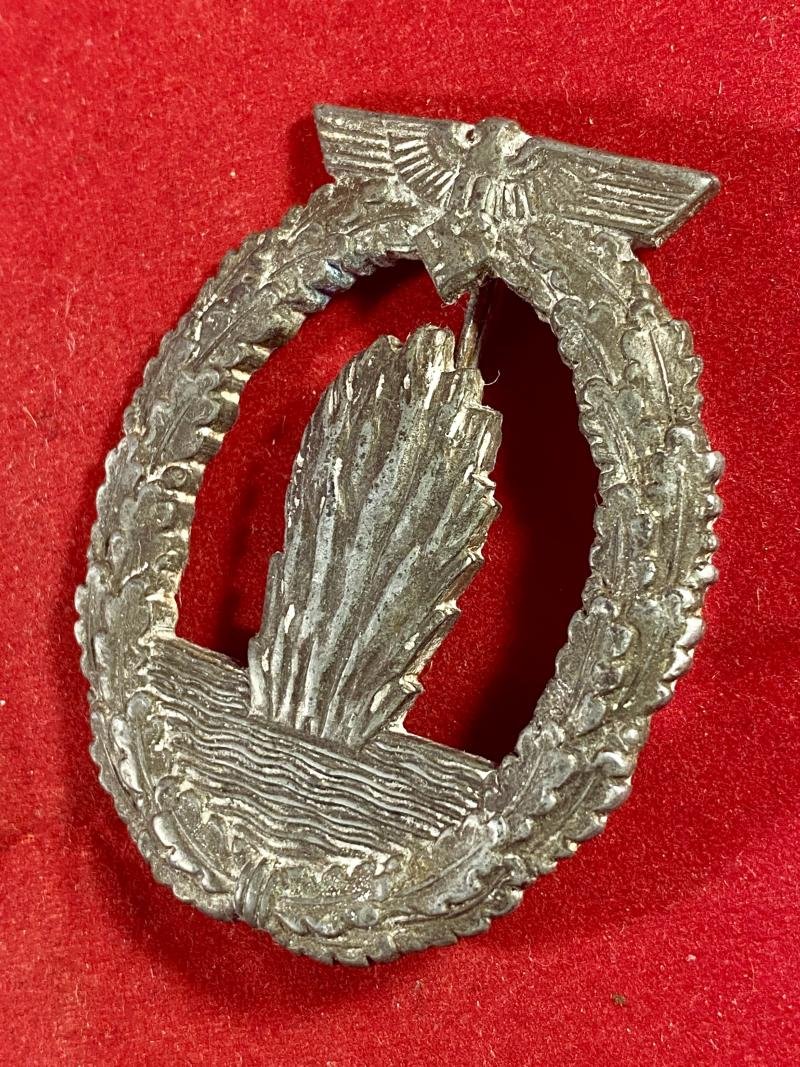 Here on offer is a WW2 German Kriegsmarine Minesweeper badge.This badge is a mid to late war zinc alloy example that has now lost nearly all of its original finish. All that remains is some tiny areas of silver finish in the recesses of the exploding sea mine.The badge retains a lot of its original fine detailing and features a design of oak leaves surrounding a detonated sea mine with the National Eagle of Germany at the top.It retains a long steel fastening pin and brass 'C' clasp on the reverse.There is no maker mark on this badge but I believe this is the type that some collectors have attributed to the 'Steinhauer and Luck' firm, although this is only going by the type of hinge.The badge has lost its original finish but is still solid with no cracks, just some small pit marks to the alloy on the reverse.It measures 2.2' (5.5cm) by 1.8' (4.5cm) and weighs 29g.Please see my pictures for the details of the condition, which complement this description.Please see my TERMS OF BUSINESS regarding Deliver Charges and Insurance regarding additional insurance cover, should you require it, BEFORE the item is dispatched.The responsibility lies with the customer to check with your Customs restrictions that this item can be imported into your country.