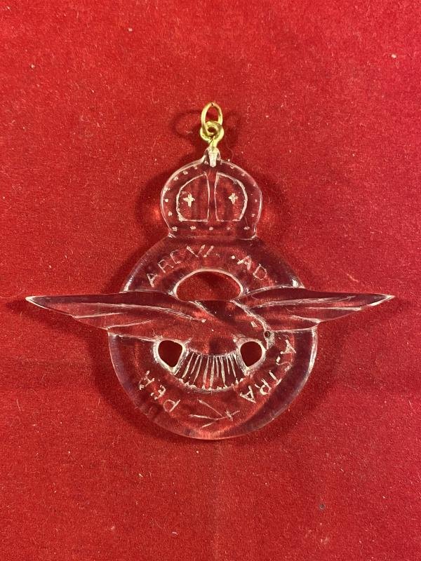 Here on offer is a really impressive handmade WW2 Perspex RAF 'cap badge' style sweetheart pendant.This pendant was made from a section of Perspex from the canopy of a damaged WW2 RAF aircraft.This large pendant has been made to look exactly like a RAF 'crested' cap badge of the period, with the spread winged eagle set against a ring, topped with a Kings Crown. It even has the RAF motto, 'Per Ardua ad Astra,' hand engraved around the ring.It is in excellent original condition and the Perspex is still crystal clear. At the top it has been fitted with a loop and ring to enable it to be worn on a thin chain.This is the best example of a WW2 perspex pendant that I have seen and would make a great addition to any RAF collection. It must have been worn with great pride.The pendant is 2' (5.2cm) high by 2.6' (6.5cm) wide and 0.16' (0.4cm) thick.It weighs 5.7g.Please see my pictures for the details of the condition, which complement this description.Please see my TERMS OF BUSINESS regarding Deliver Charges and Insurance regarding additional insurance cover, should you require it, BEFORE the item is dispatched.The responsibility lies with the customer to check with your Customs restrictions that this item can be imported into your country.Thanks for taking the time to look.