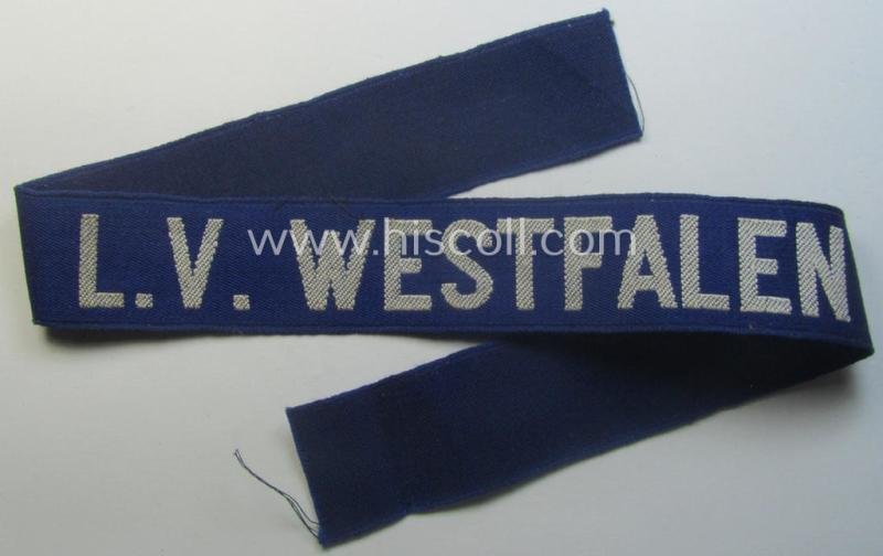 Minimally used, typical bluish-coloured- and/or linnen-based 'Der Stahlhelmbund' (ie. 'Der Stahlhelm' - Bund der Frontsoldaten (or: Sta)' cuff-title (ie. 'Ärmelstreifen') entitled: 'L.V. Westfalen'