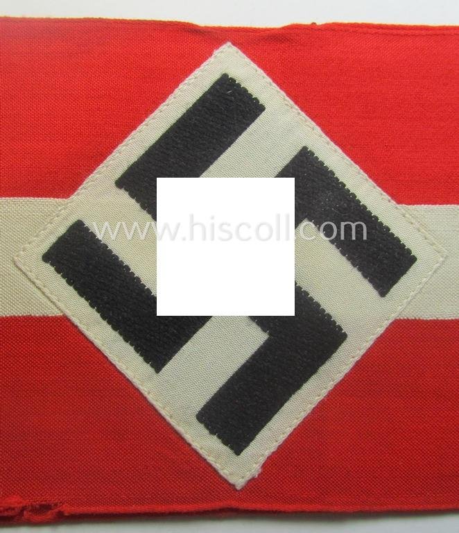 This is an attractive - and I deem just minimally used- and/or worn - example of a 'standard-issued'- (ie. entirely woven) pattern, bright-red-coloured so-called: HJ- (ie. 'Hitlerjugend'-) related armband (ie. 'Armbinde') being a neat example that is void of an 'RzM'-etiket and that comes in an overall very nice- (ie. I deem hardly worn- and/or used-), condition. These linnen-based armbands were 'standard'-issue for usage by the various HJ- (ie. DJ-) members and/or officials (and were worn on the left upper-arm of the linnen shirts and/or tunics). This example - which comes still 'off-factory sewn-together - has a total size of approximately 44 cms. and is 11 cms. wide as more often - and is constructed from bright-red-coloured linnen. It shows a horizontally- (and neatly interwoven!) white-coloured 'centre-stripe'. Next to this, it shows a square-sized: 'swastika'-patch attached (as can be seen on the pictures). The armband only shows moderate age, wear and/or staining: a tiny 'flaw' can be noticed on the left-side bottom-rim (as can be seen on the pictures). Simply a neat and desirable, 'standard'-pattern- and just minimally used HJ-related 'Armbinde' that is - I deem - accordingly priced!