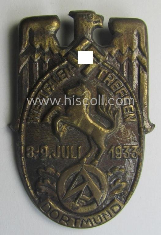 Commemorative- and/or copper-toned, golden-bronze-coloured N.S.D.A.P.- (ie. SA-) related 'tinnie' being a non-maker-marked example showing a detailed eagle-device, SA-logo- and text: 'Westfalentreffen - Dortmund - 8.9. Juli 1933'