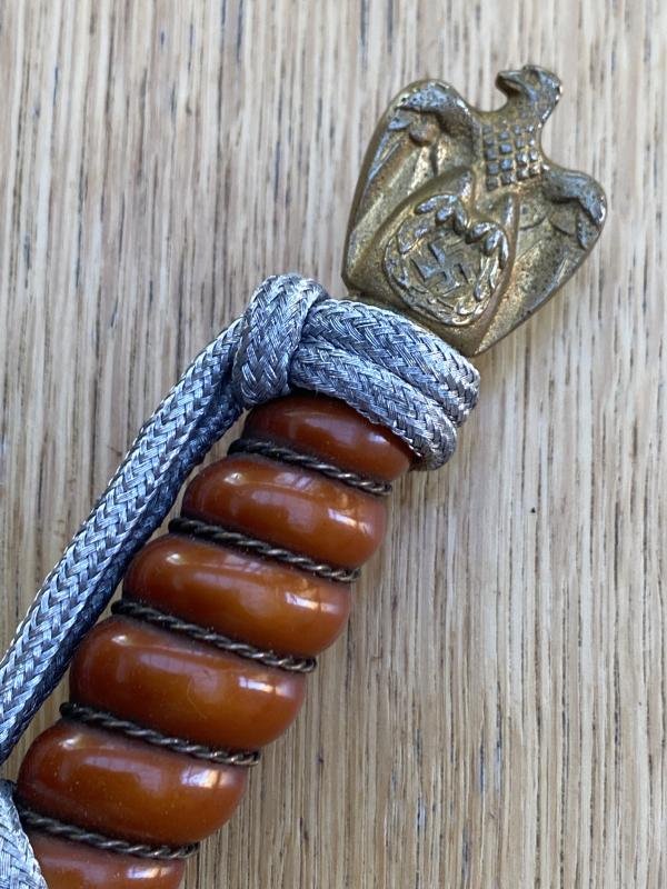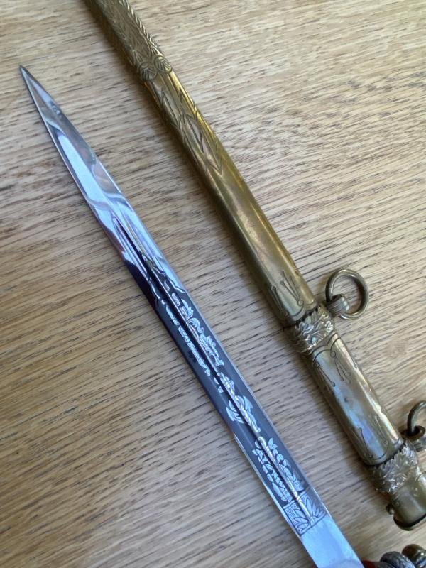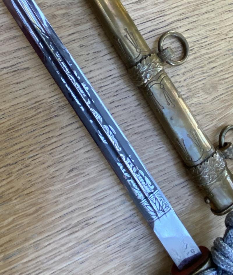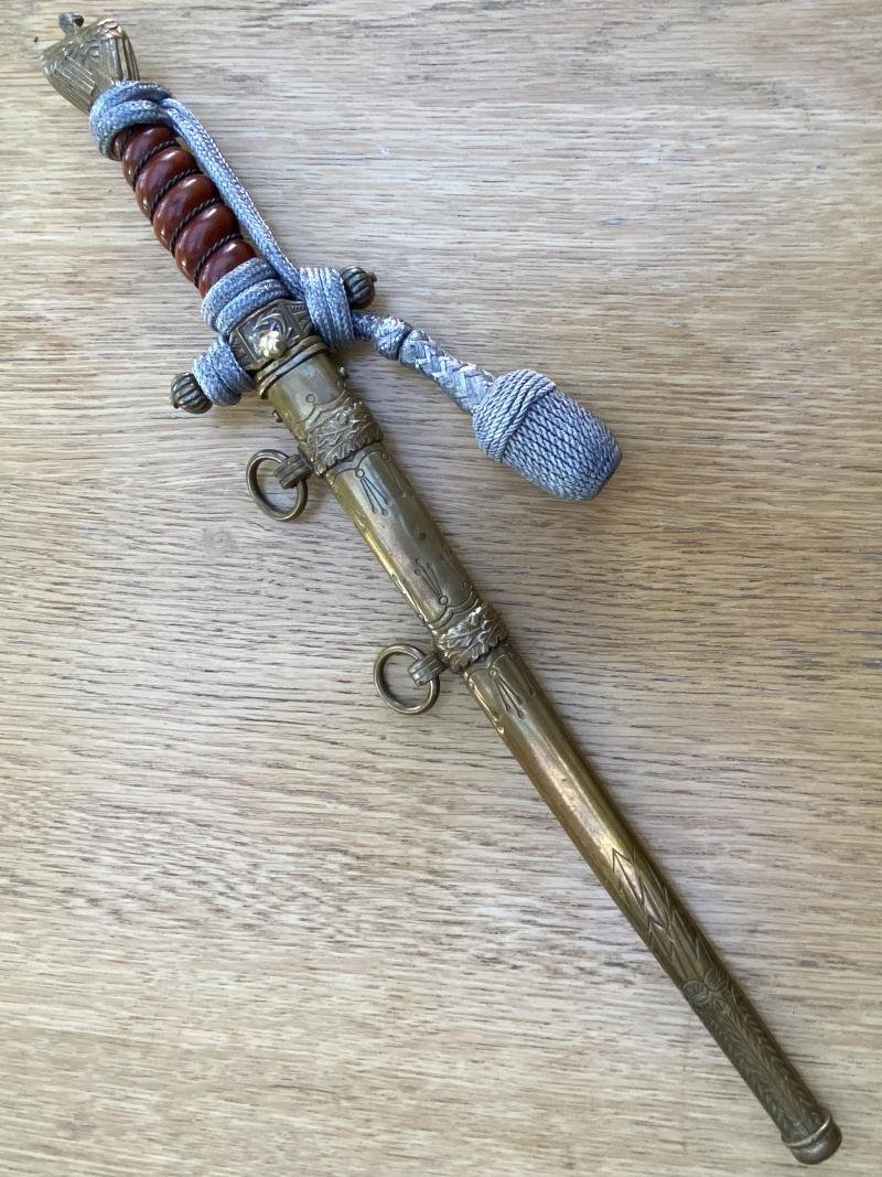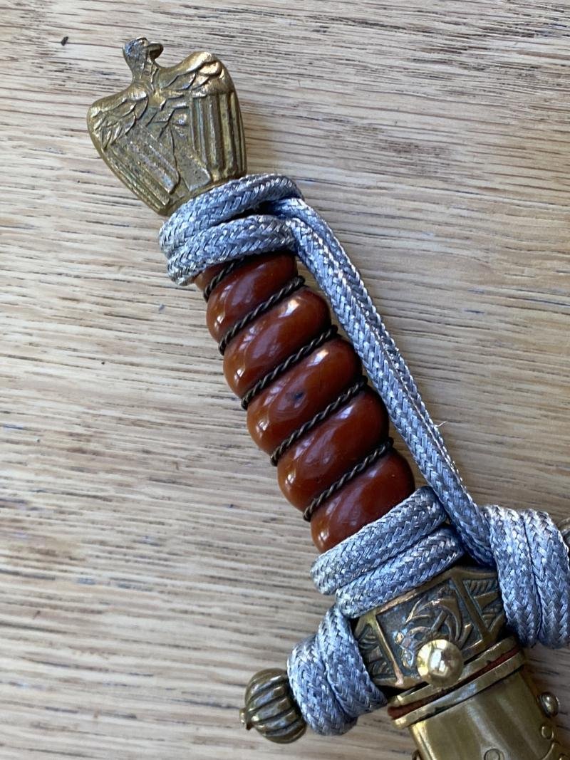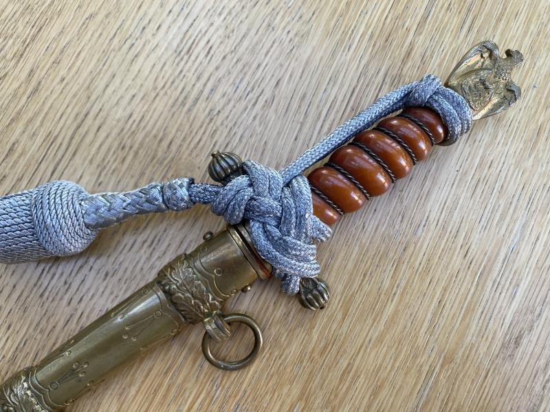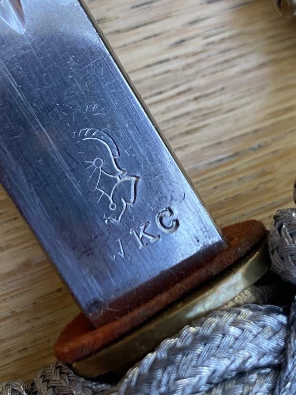 One of the best looking combinations and now VERY hard to find. This is a lovely looking navy dagger made by WKC with a deep orange solid celluloid grip and thick silver bullion 42cm knot. WKC were one of the very few makers who had these coloured grips. I am pretty sure it was a requested cost option as most WKC daggers have a normal cream celluloid over wood grip. These solid celluloid grips go from a mid-yellow to deep orange and the colour after all these years is caused by exposure to sunlight. The dagger is a classic WKC product in all brass. Nice detailed eagle pommel. Orange grip with brass wire. A nice thick corded 42cm bullion knot that is tied in the correct manner and 'set' in place. Lightening bolt scabbard in near perfect shape. The blade is in mint condition with deep grey perfect etching featuring anchor and dolphin motifs. Needle sharp point. Riccasso has WKC knights head trademark deeply stamped and the normal red felt WKC blade buffer.Great looking dagger!!'The sale of Knives and other Edged Weapons are restricted to those aged over 18. Verification of age is required before purchase is concluded.'