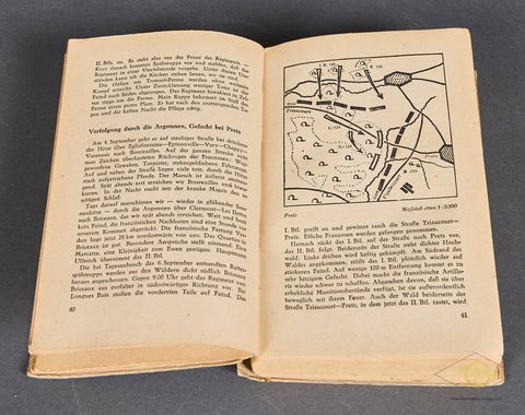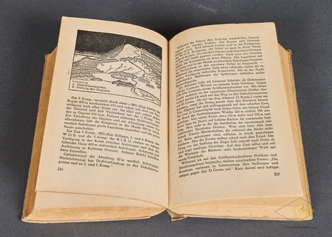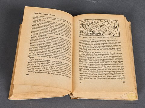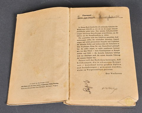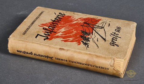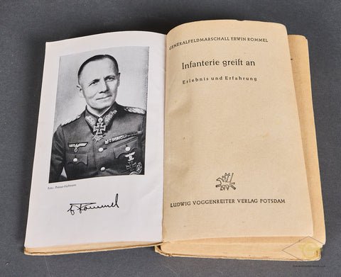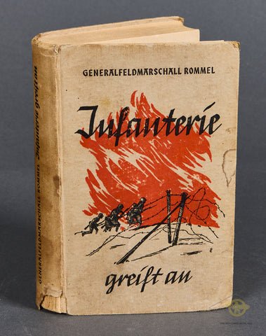 'Infantry Attacks' (Infanterie greift an)-A classic German language military tactics book written by German Field Marshal Erwin Rommel. This 384-page hardcover book details Rommel's personal combat experiences and innovative leadership from World War I. It emphasizes aggressive, mobile tactics, and surprises to gain victory. It was highly successful, becoming a regarded military textbook, significantly contributing to Rommel's rise through the ranks, and influencing military thought, including that of U.S. General George S. Patton. This was printed in 1944. It is quite clean, though there are three names written in pencil on the inside cover. There is a table of contents, and several illustrations with maps and black and white sketches. The hardcover shows some light staining, and the spine has a significant tear near the bottom portion, but overall, this book is in good condition.