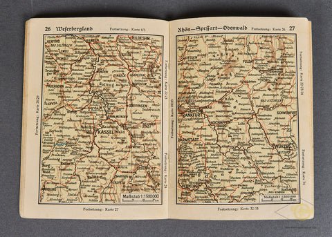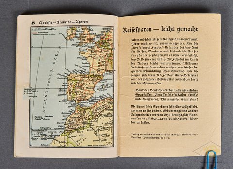 KDF Taschen Atlas (Pocket Atlas) 1930's Kraft Durch Freude, (Strength Through Joy) Pocket Atlas-This is a small pocket atlas that contains maps of Germany and other parts of Europe. It shows the original price for 20 pfennigs. The KDF was a state run leisure organization that was instituted to build morale with workers. They planned cruises, and other events for people. This book contains 48 pages and is in very good condition.History: Kraft durch Freude translates to 'Strength through Joy', (abbreviated KdF) was a state-operated leisure organization in Germany. It was a part of the German Labor Front (DAF), the national German labor organization at that time. Set up as a tool to promote the advantages of National Socialism to the people, it had become the world's largest tourism operator by the 1930s. The KdF was supposed to bridge the class divide by making middle-class leisure activities available to the masses. It also sought to bolster the German tourist industry, something it did successfully up until the outbreak of World War II. By 1934, over two million Germans had participated in a KdF trip; by 1939 the reported numbers lay around 25 million people. With the outbreak of war in 1939, the organization was mothballed.