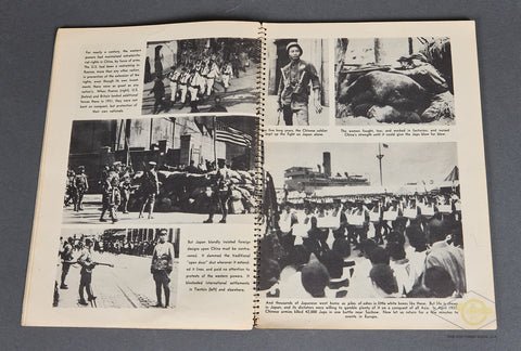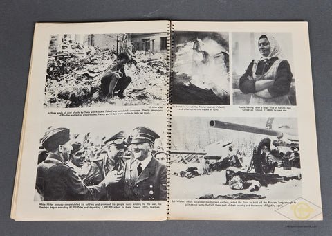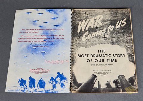 The War Comes to US 'The Most Dramatic Story of Our Time'-This original photo book was printed in 1942 by Bartholomew House and authored by John Paul Adams. It is a photo story, with captions and text in English, that documents the beginning of World War II, right up to the point that the USA entered the war, after Pearl Harbor. This is a fascinating study. A lot of this is old news to you history buffs, but if you want an illustrated, interesting timeline of how the war started this would be a fun read for you. The book itself is in very good condition. The binding is in place but be gentle with the old pages. The edges have some shelf rubbing, but this is very good.