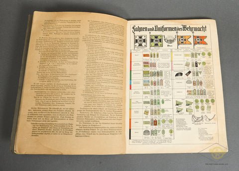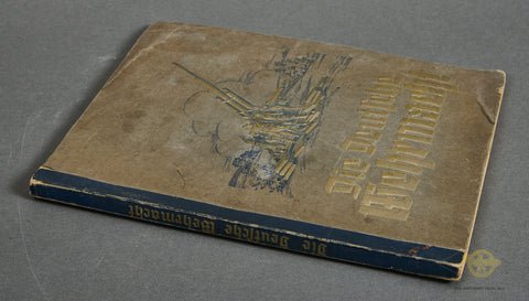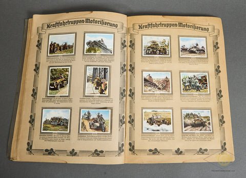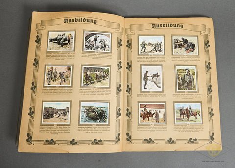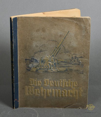 Die Deutsche Wehrmacht-This large format, soft cover book features a dramatic, embossed anti-aircraft scene on the front cover. This is one of the famous cigarette type books that citizens purchased and then added the full color pictures to after subsequent cigarette purchases (that benefited the Wehrmacht no doubt!). This one is mostly complete with all the images intact, except for 5 that are missing. There are a few photos that are loose and need to be repasted. This book is almost 100 years old, and is in great shape especially consider its age. It is copyrighted 1936 by Cigaretten-Bilderdienst Dresden. Great condition!