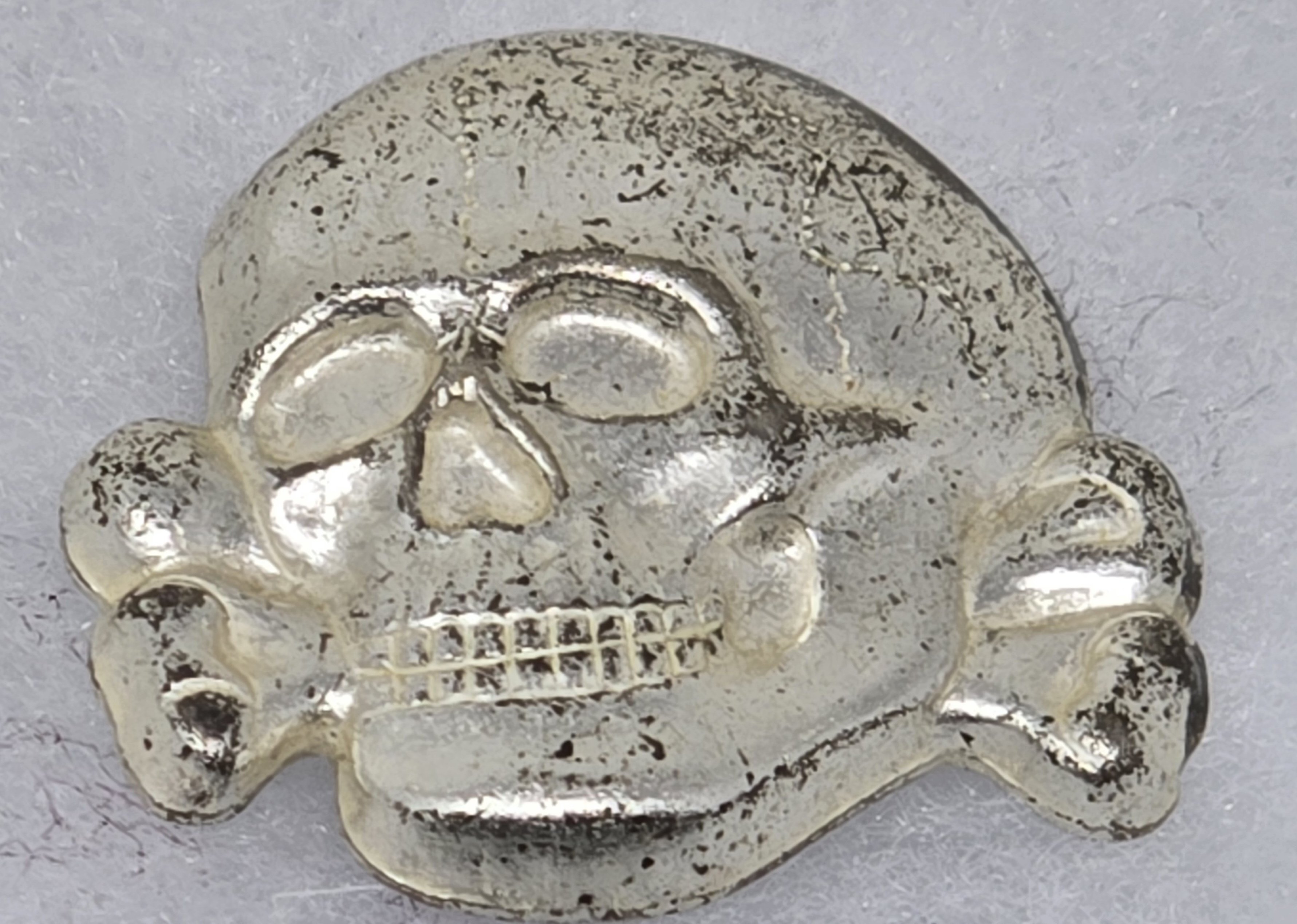 This incredible piece is a near fully mint example of the early Deschler type, with eyes filled in, and the perpendicular pin apparatus in the back. The skull has been vetted by the best of the best and is correct / original in every way. For the most discriminating SS insignia collection, COA accompanies.