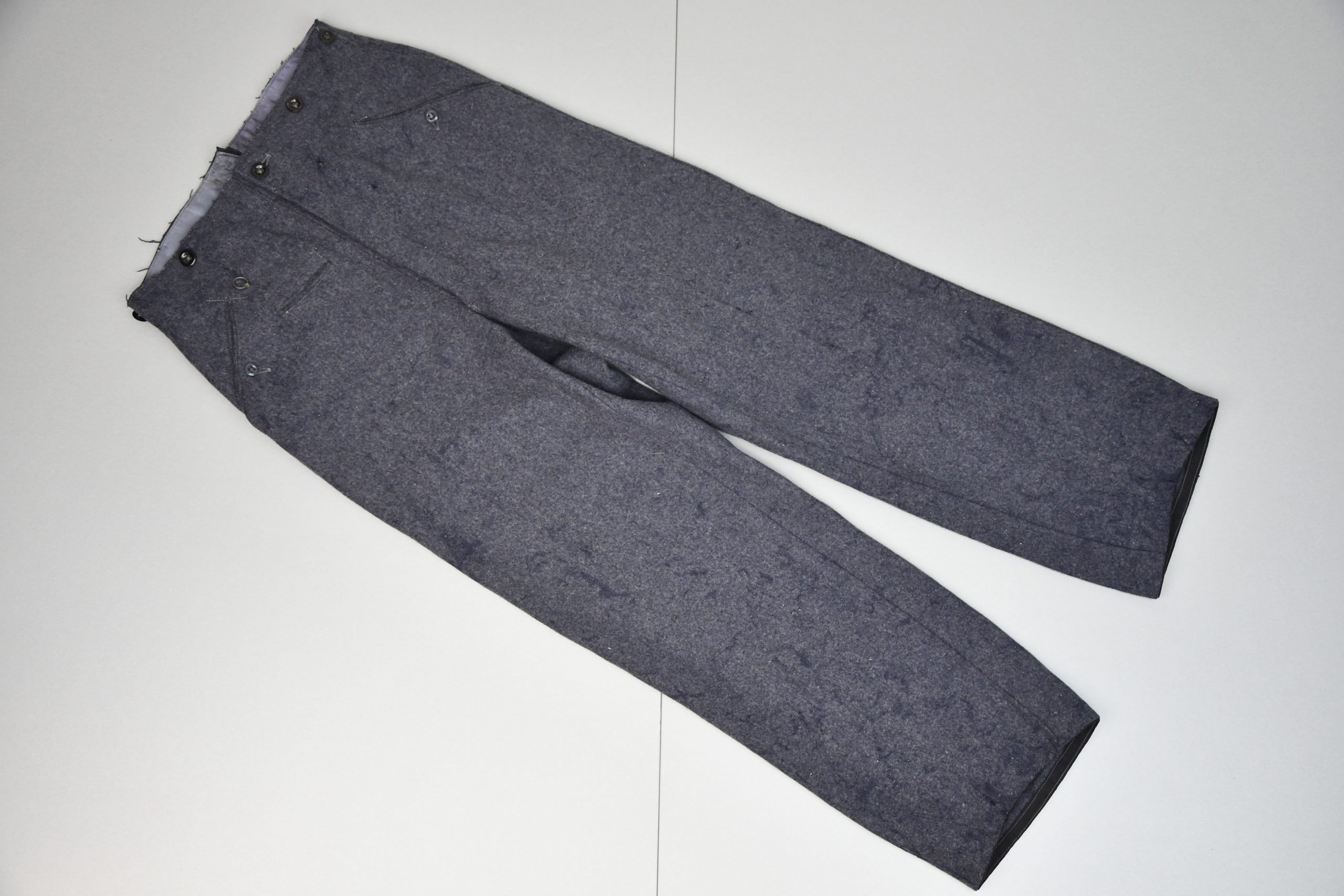 Light worn pair of M40 blue colored Luftwaffe trousers executed in wool. Maker marked with RBNr. (hard to read!). Shows some small moth damage/grazing but void of any major problems or damage. Complete with all blue glass buttons. The wool is still soft and does shows light wear.