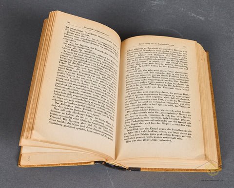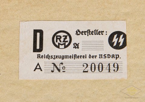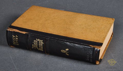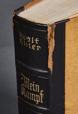 Mein Kampf Wedding (Hochzeitsausgabe) Copy-This is a wedding copy which is in very good condition. This is an unissued copy, as it is only signed by the Burgemeister (Mayor) of Aachen. The couple's names are not filled out, so this may have been pre-signed by the mayor and ready to use for any future ceremonies. I cannot find a print date on this book, just the copywrite date of 1925. At the time of the printing of this edition there were over 8,400,000 copies of Mein Kampf in print, among the very best-selling books in the world! The spine on this copy is well used; you can see cracking and spine loss to the black at both the top and the bottom. Please look closely at the photos. There is an SS RZM tag that someone has affixed to the inside cover. We are not sure if this was done by a GI, or why this happened. We have not attempted to remove it. Otherwise, this edition is very good. All 782 pages are clean, as is the sepia photo of Hitler and the dedication page. Priced to sell.
