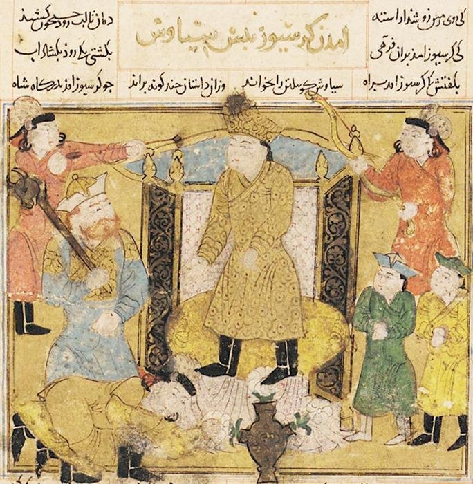 A Persian all iron 'Mace of Rostam' the mighty Paladin of Persia. The mace's head is a full bull's head, after Rostam's fabulous Mace, with applied horns and ears, with iron haft with engraved decoration throughout the whole mace decoration and all three sides of the bull's head. Good overall condition for age.See Allan and Gilmour fig.26 for a closely related example, and p.189 and 315 for a discussion of these maces. Rostam, sometimes spelled Rustam, was the son of Zal and Rudaba, and the most celebrated legendary hero in Shahnameh and Persian mythology. In Shahnameh, Rostam and his predecessors are Marzbans of Sistan (present-day Iran and Afghanistan). Rostam is best known for his tragic fight with Esfandiar; the other legendary Persian hero, for his expedition to Mazandaran (not to be confused with the modern Mazandaran province); and for tragically fighting and killing his son, Sohrab, without knowing who his opponent was. Rostam was eventually killed by Shaghad, his half-brother.Rostam was always represented as the mightiest of Iranian paladins (holy warriors), and the atmosphere of the episodes in which he features is strongly reminiscent of the Parthian period. He was immortalized by the 10th-century Persian poet Ferdowsi in the Shahnameh, or Epic of Kings, which contains pre-Islamic Iranian folklore and history.He rode the legendary stallion Rakhsh and wore a special suit named Babr-e Bayan in battles. While out hunting Rostam awoke from his sleep to find Rakhsh had gone missing. He was distraught at losing his beloved horse and he tracked him as far as the city of Samangan. Here he greeted the King and asked for his help to find Rakhsh.While in Samangan, Rostam met the king's lovely daughter Tahmina. The Shahname describes her as elegant as a cypress tree. One night she came to his room:' My name is Tahmineh; longing has tornMy wretched life in two, though I was bornThe daughter of the king of Samangan,And am descended from a warrior clan.But like a legend I have heard the storyOf your heroic battles and your glory,Of how you have no fear, and face alonedragons and demons and dark unknownOf how you sneak into Turan at nightAnd prowl the borders to provoke a fight,Of how, when warriors see your mace, they quailAnd feel their lionhearts within them fail.I bit my lip to hear such talk, and knewI longed to see you, to catch sight of you,To glimpse your martial chest and mighty face-And now God brings you to this lowly place.If you desire me, I am yours, and noneShall see or hear of me from this day on.'But their time together was brief, because once Rakhsh was found, Rostam departed for his homeland. Nine months later Tahmina gave birth to a son Sohrab, who grew up to be a warrior like his father Rostam. Scene from the Shahnama: Garsivaz prostrating himself before Siyavush in the presence of Rustam. 14th century, 54cms