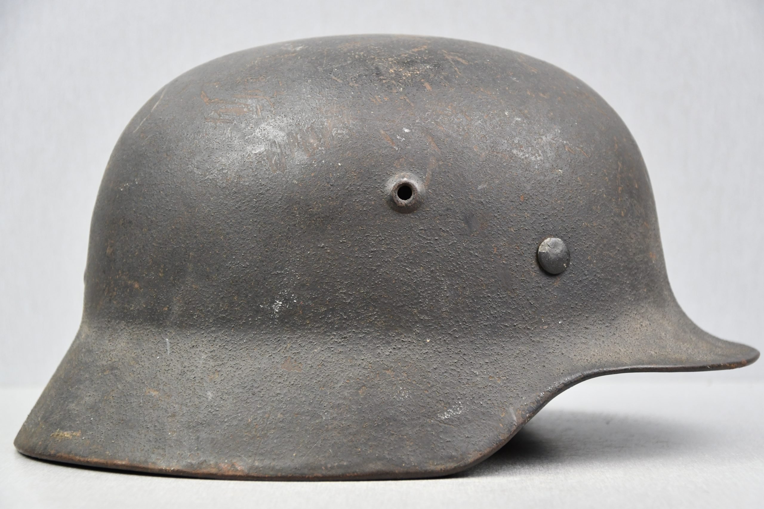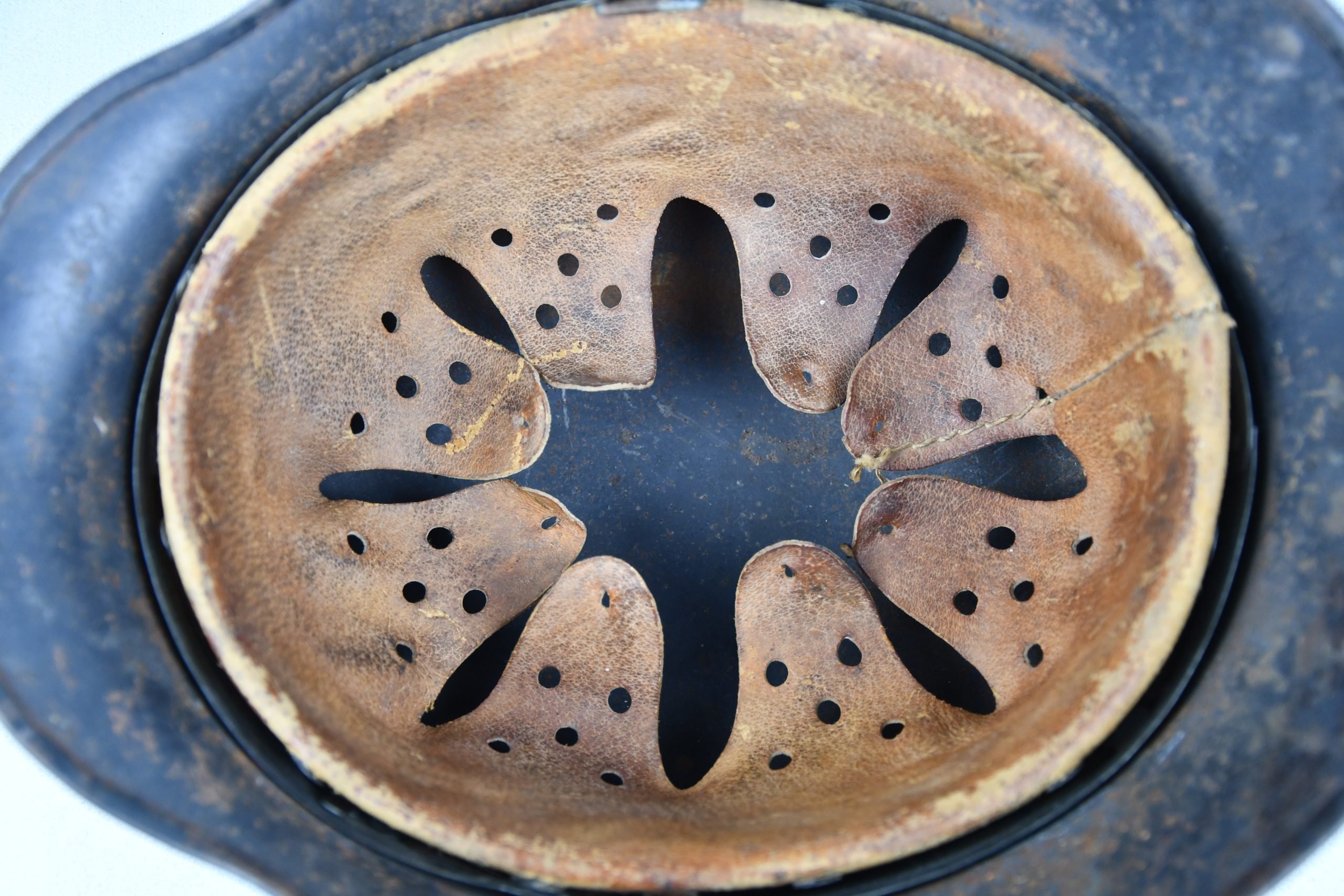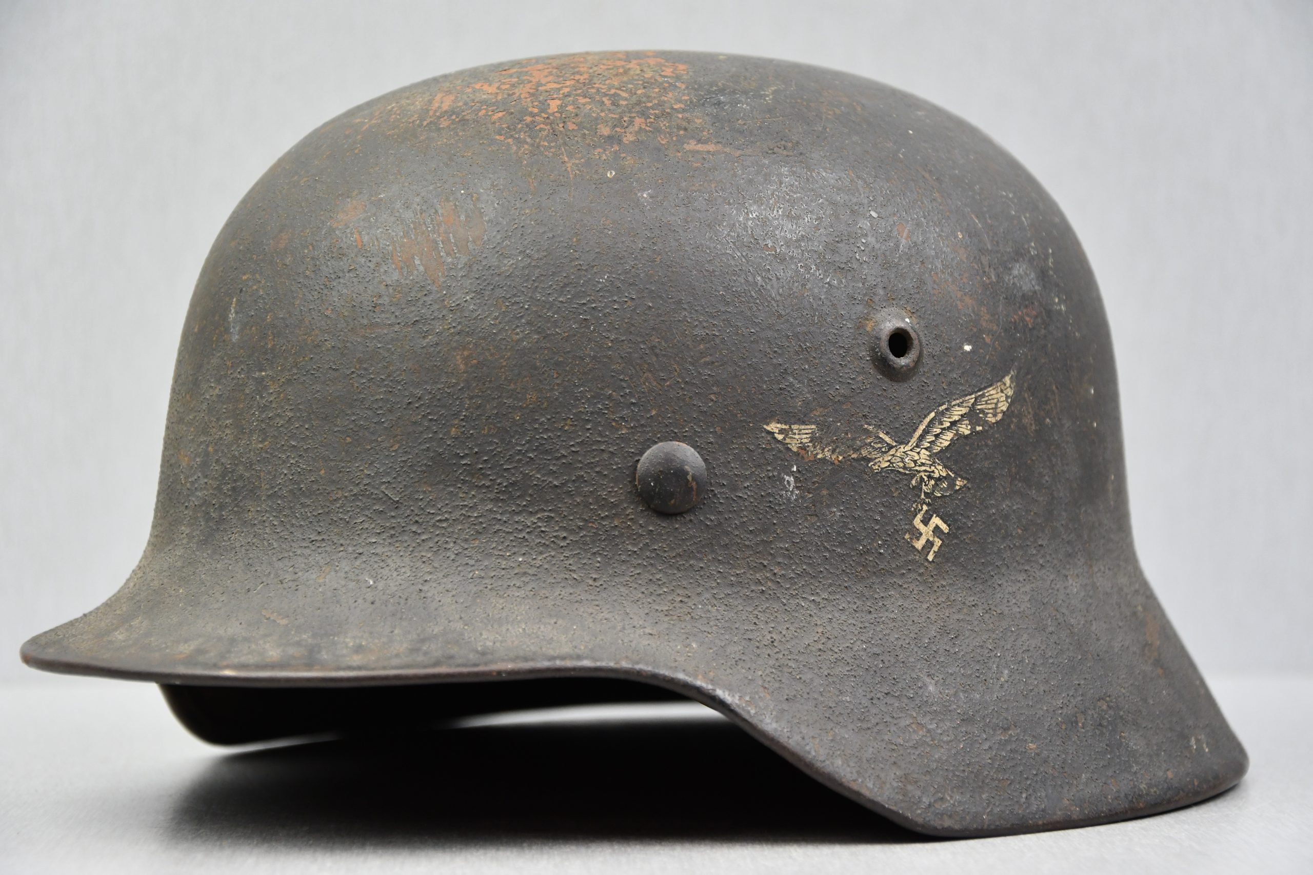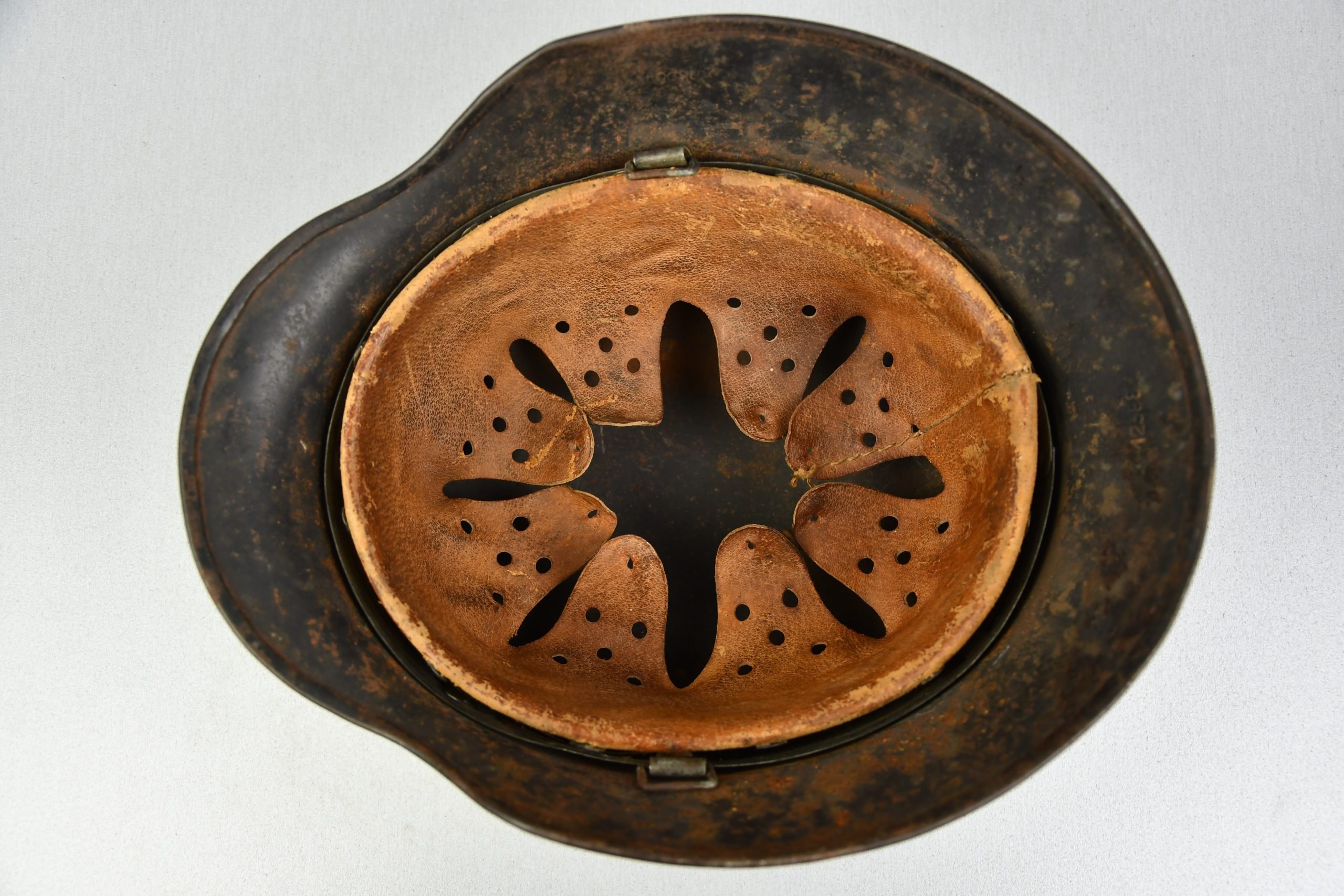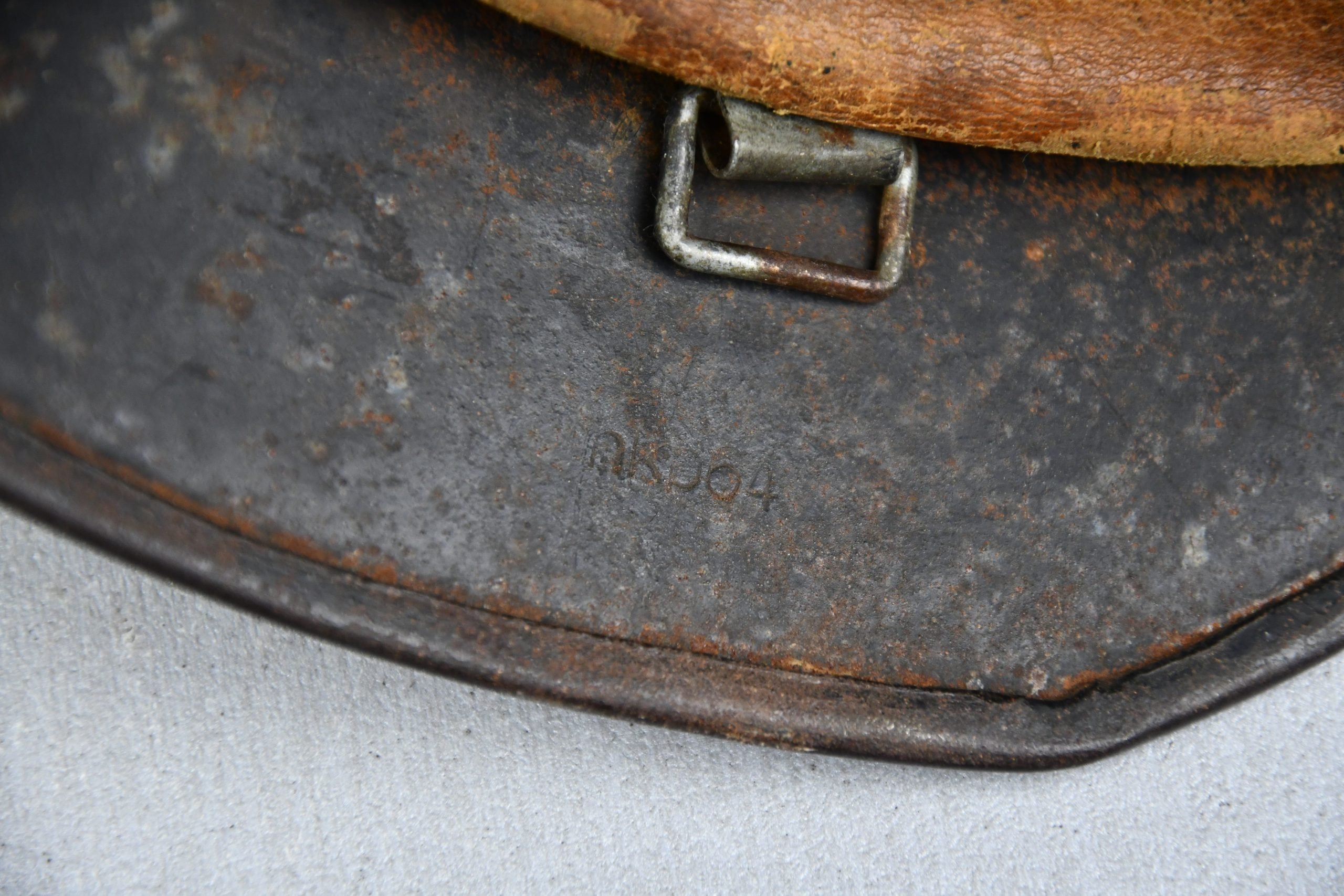 Interesting mid war produced M40 pattern Luftwaffe helmet in good condition. The decal on the left side shows combat wear and remains 60% intact. The exterior sand mixed paint is typical for this manufacturer (SE/hkp). The helmet is complete with its original liner. The leather is complete and feels supple and strong. Maker marked by hkp (former SE) and has a size 64 shell. Lot number 12388 (interesting, we sold a helmet with the same number a while agohere). A great looking single decal Luftwaffe helmet!