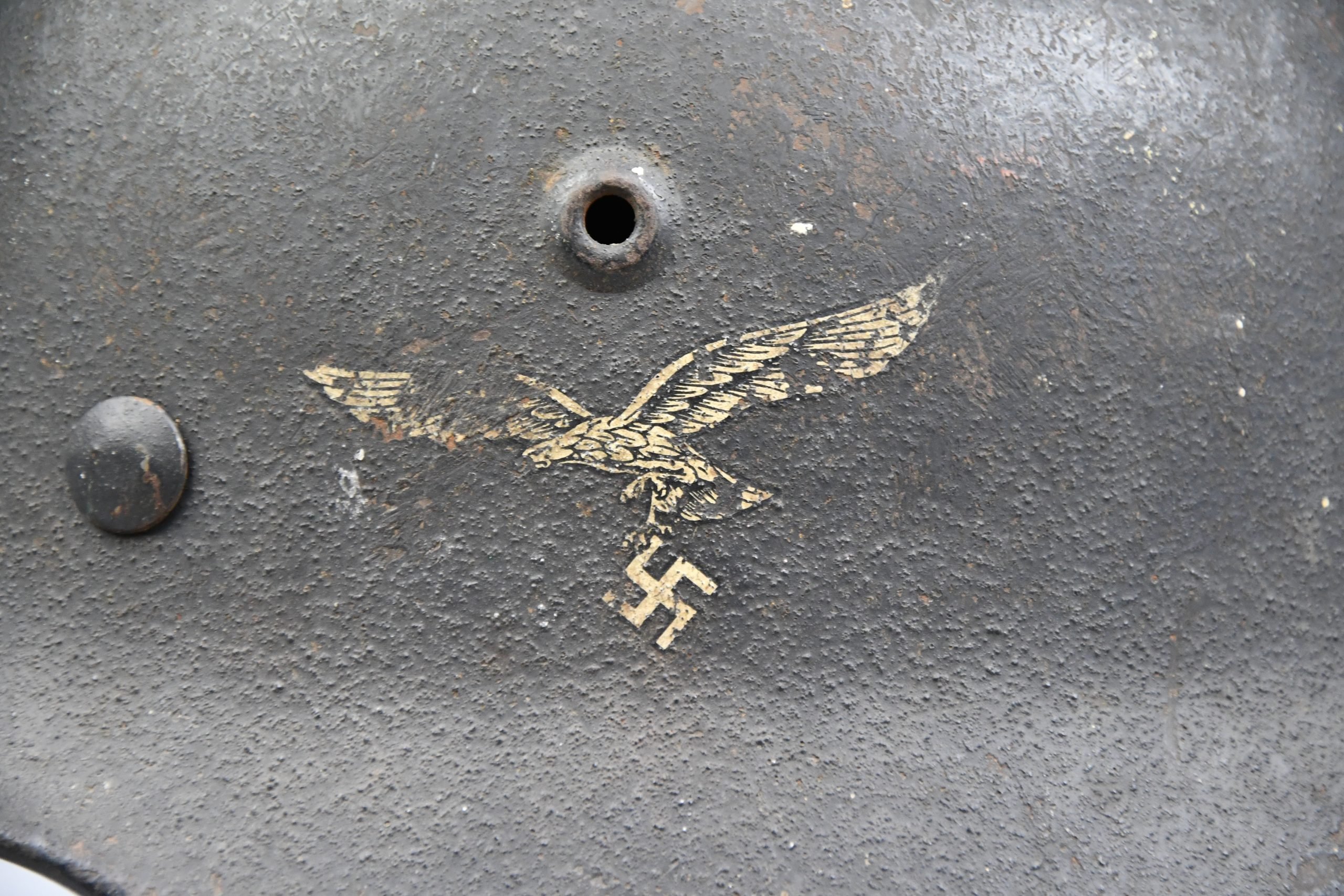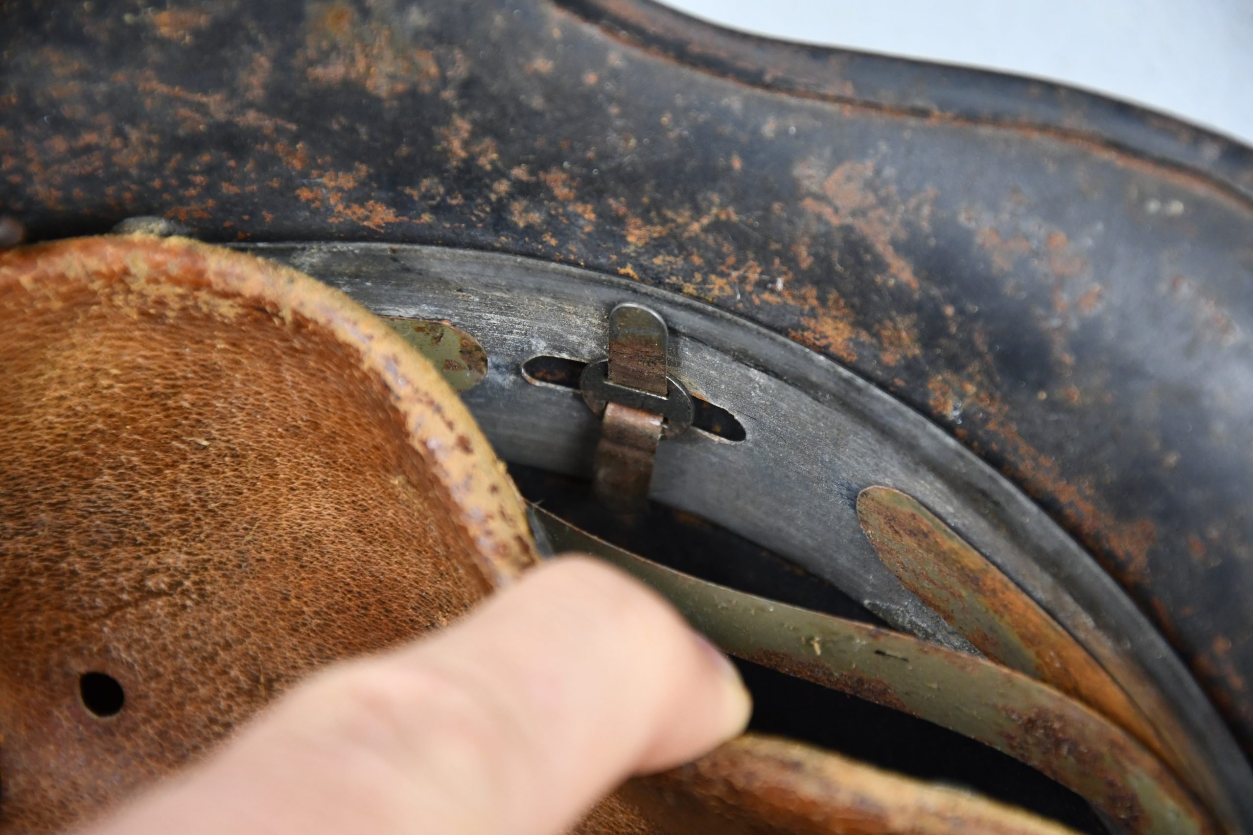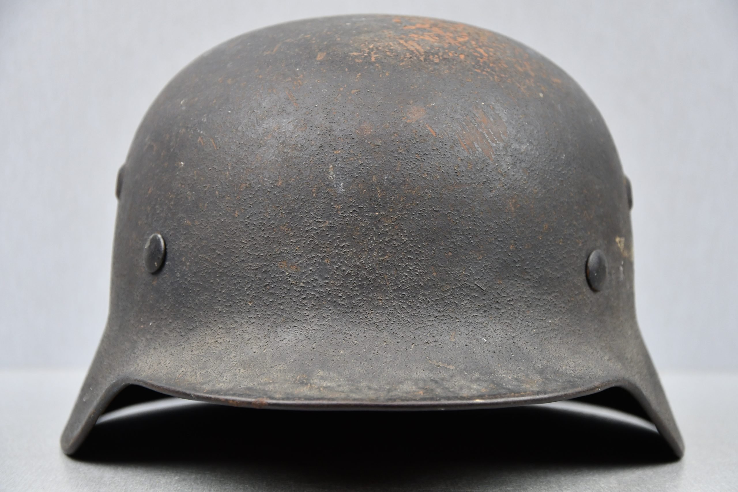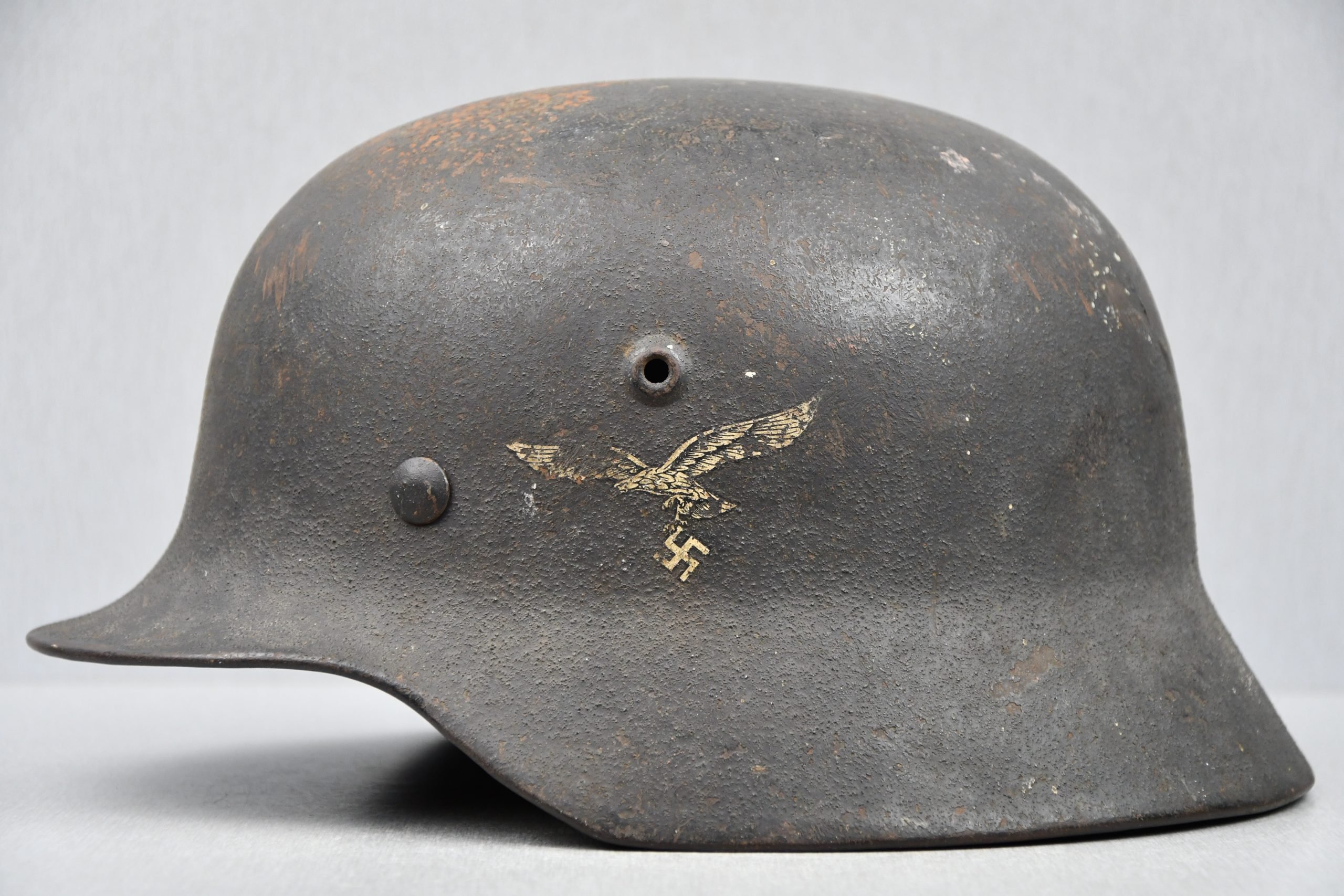 Interesting mid war produced M40 pattern Luftwaffe helmet in good condition. The decal on the left side shows combat wear and remains 60% intact. The exterior sand mixed paint is typical for this manufacturer (SE/hkp). The helmet is complete with its original liner. The leather is complete and feels supple and strong. Maker marked by hkp (former SE) and has a size 64 shell. Lot number 12388 (interesting, we sold a helmet with the same number a while agohere). A great looking single decal Luftwaffe helmet!