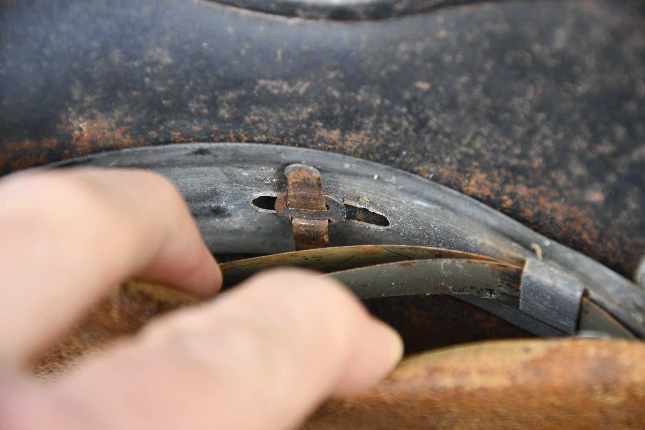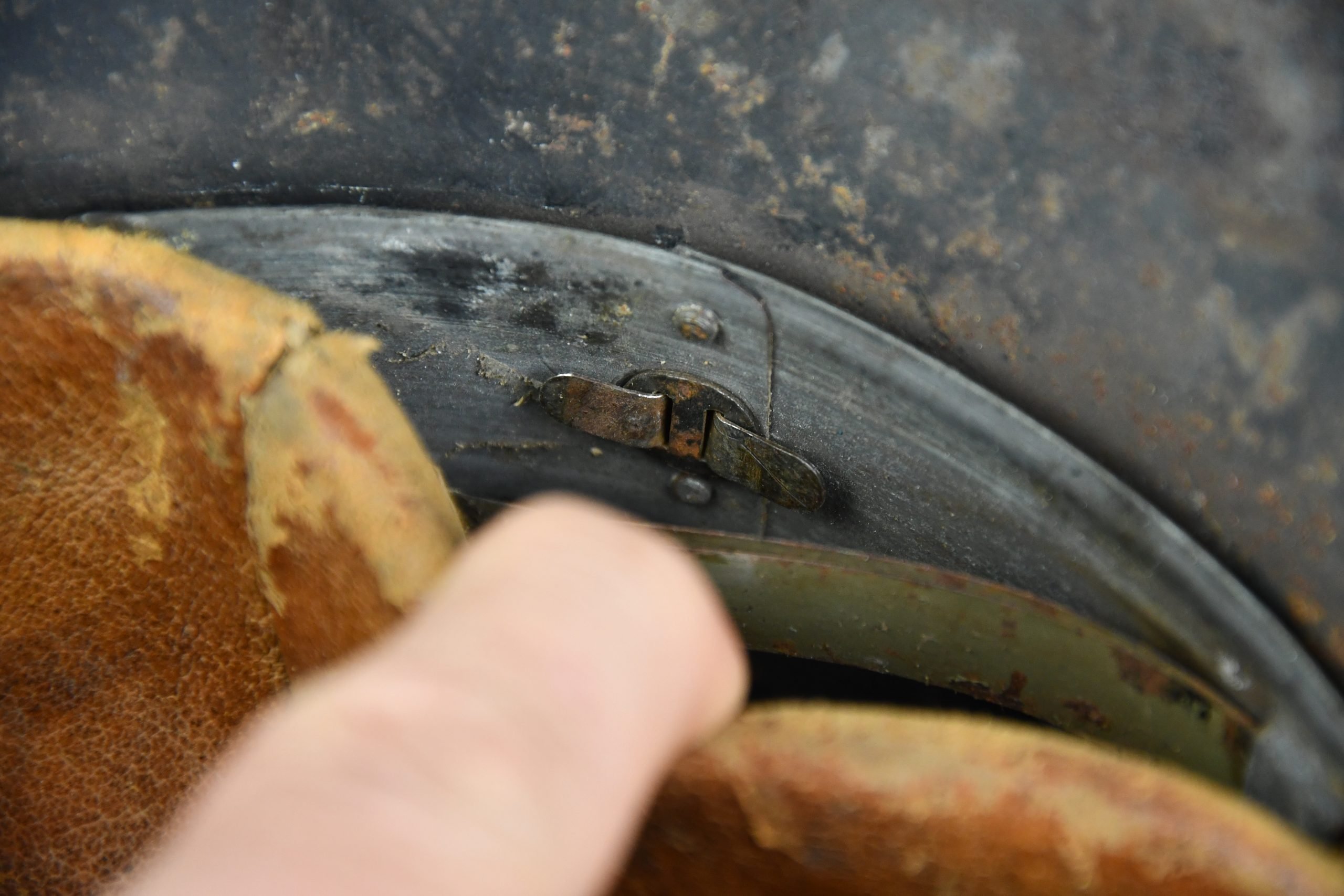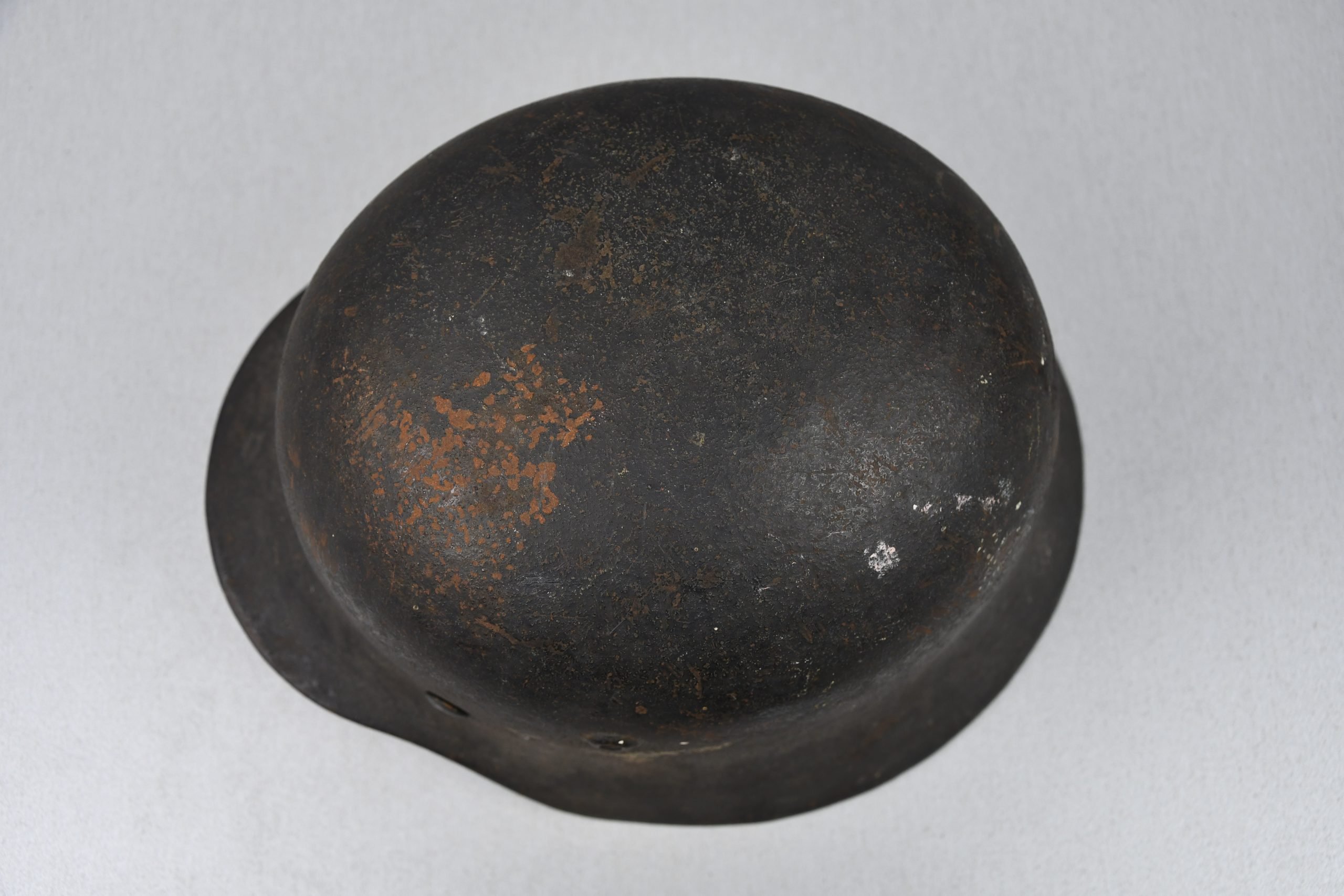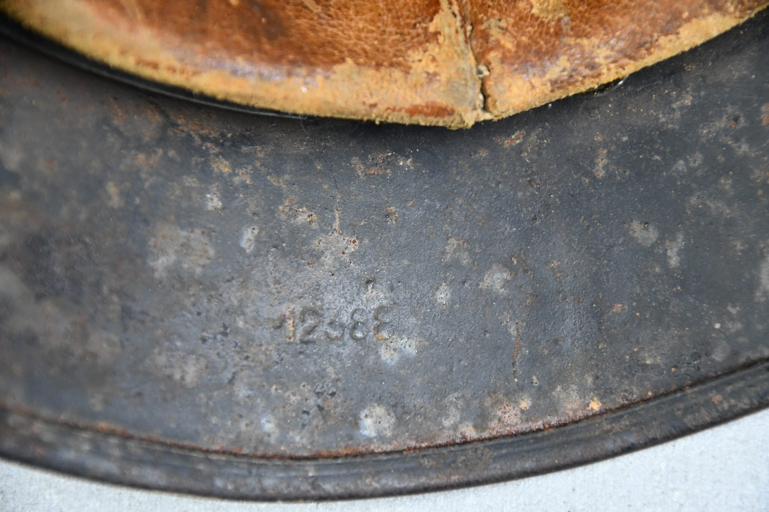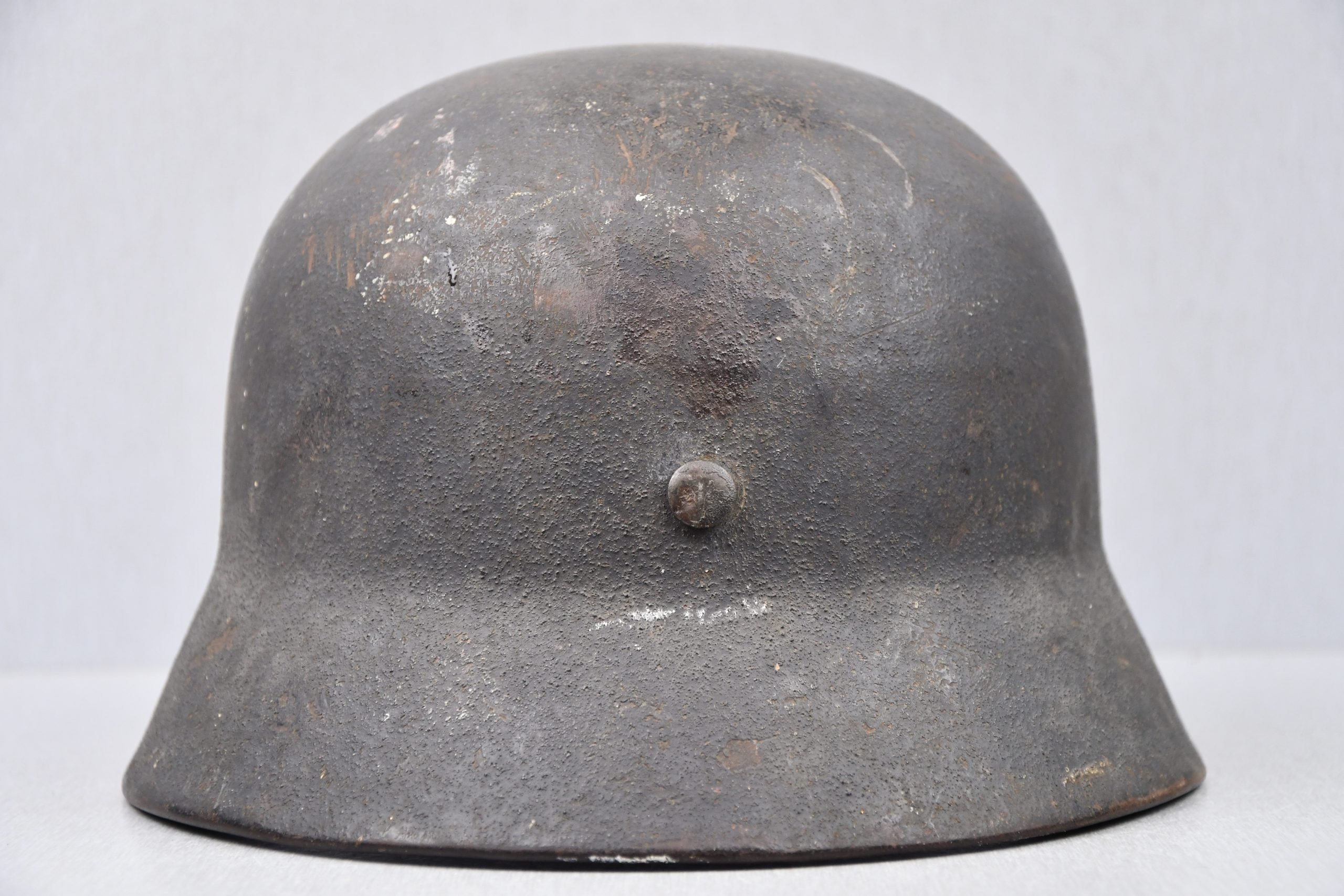 Interesting mid war produced M40 pattern Luftwaffe helmet in good condition. The decal on the left side shows combat wear and remains 60% intact. The exterior sand mixed paint is typical for this manufacturer (SE/hkp). The helmet is complete with its original liner. The leather is complete and feels supple and strong. Maker marked by hkp (former SE) and has a size 64 shell. Lot number 12388 (interesting, we sold a helmet with the same number a while agohere). A great looking single decal Luftwaffe helmet!