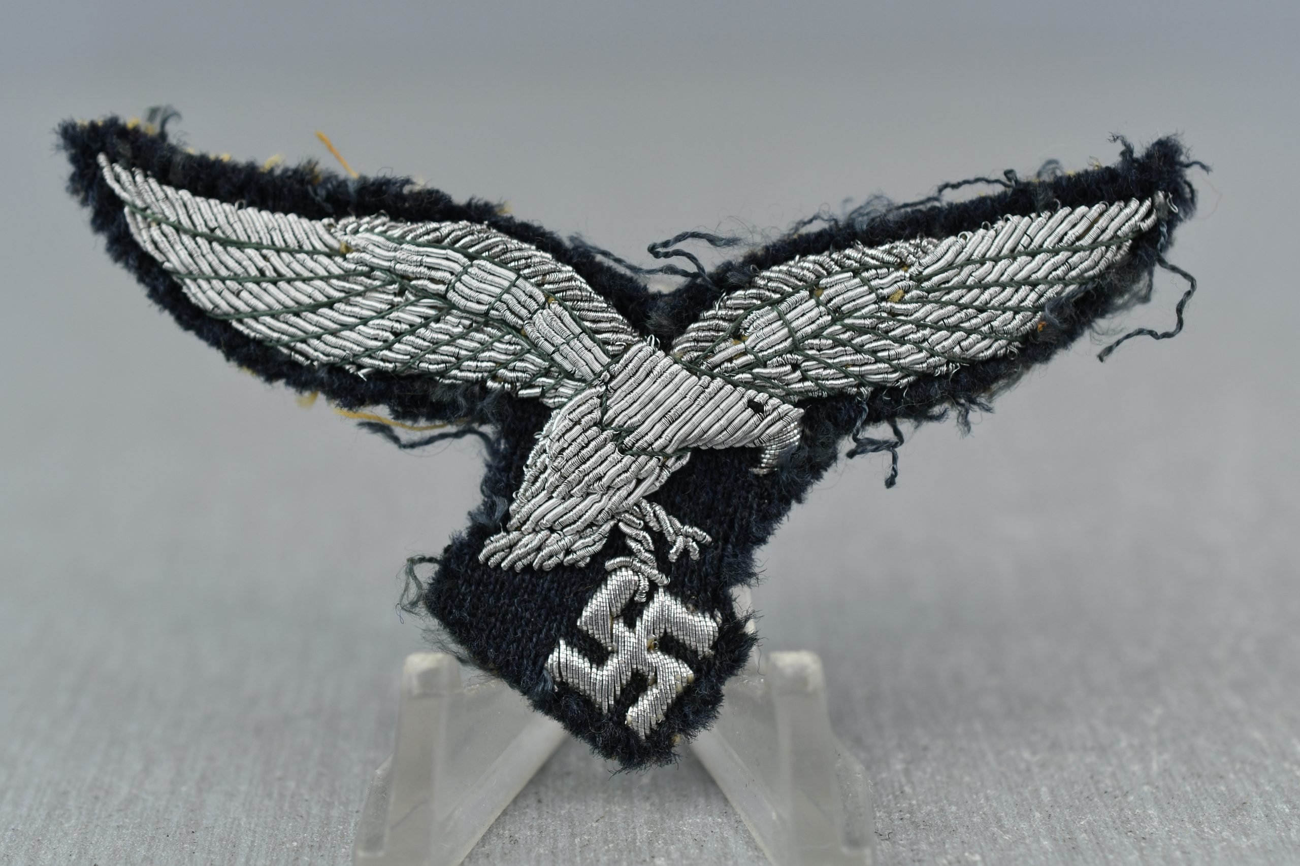 Uniform removed large Luftwaffe officer breast eagle in worn condition. Executed in silver bullion thread, hand embroidered on blue wool.