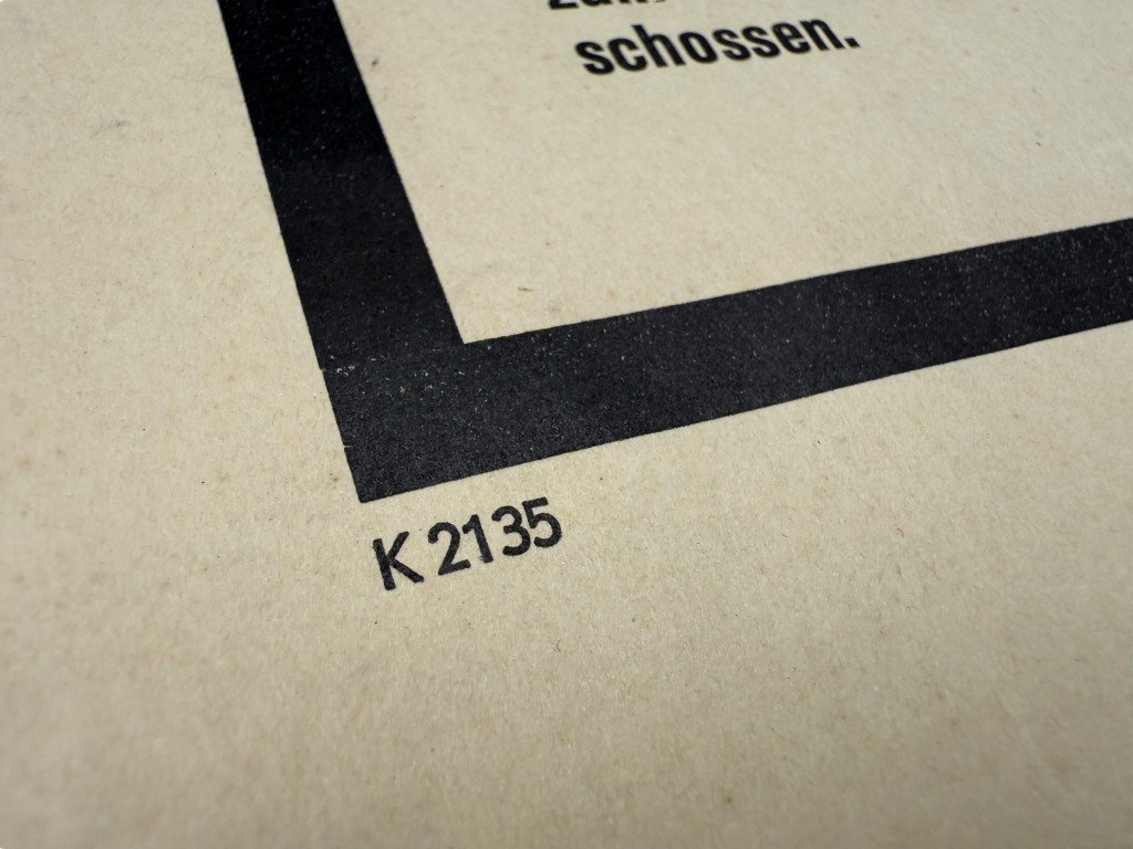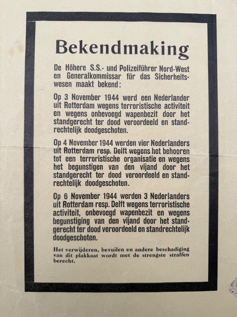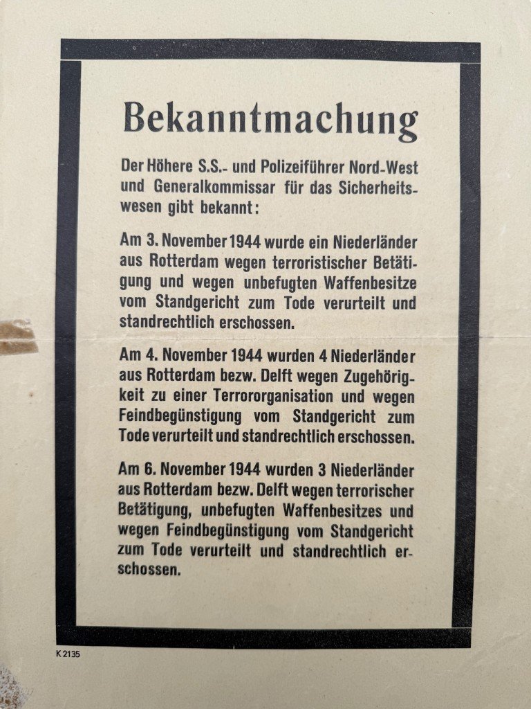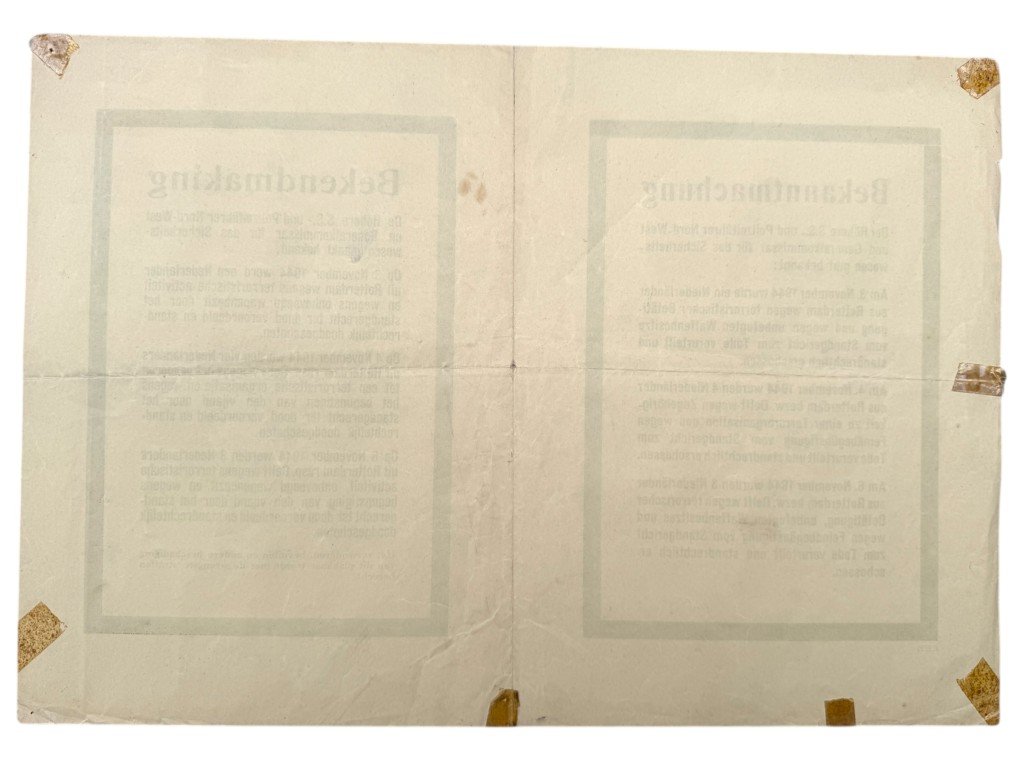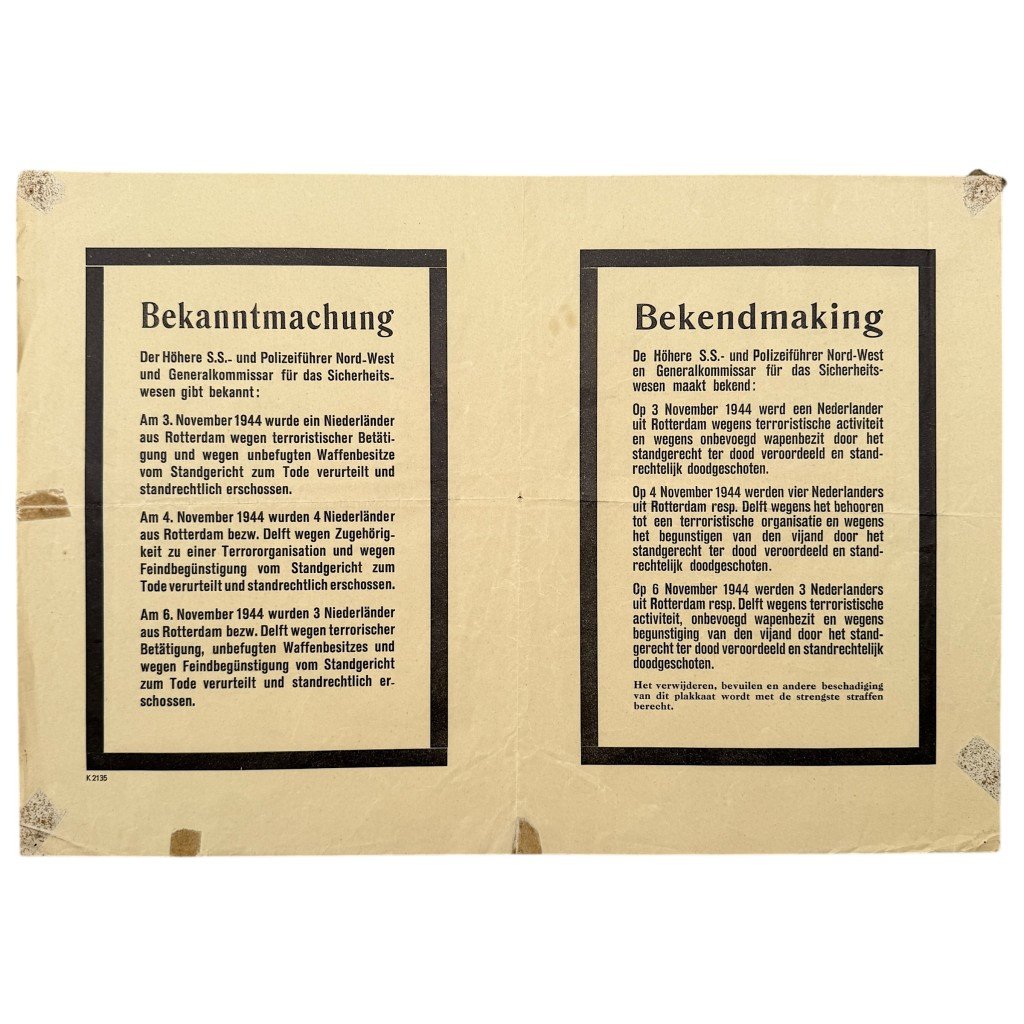 This German notice (Bekendmaking) from November 1944 was issued by the Höhere SS- und Polizeiführer Nord-West and the Generalkommissar für das Sicherheitswesen.This bilingual notice (in German and Dutch) was distributed in Rotterdam and Delft, announcing the execution of several Dutch resistance members convicted of 'terrorist activity,' 'unauthorized possession of weapons,' and 'aiding the enemy.'Four people from Rotterdam and Delft were summarily executed by firing squad at the Schietbaan shooting range on Kralingseweg for their activities in the resistance: Hendrikus Karel Jägers, Kristiaan Hendrik Ketel, Johannes Franciscus van Merriënboer, and Johannes Cornelis Timmers.The poster bears the printer's code K2135.Such notices were used by the occupying forces to spread fear among the population and reinforce control during the final phase of the German occupation.The poster is in good used condition with signs of age consistent with its history.Dimensions: 50 x 35 cmAn interesting and authentic World War II poster, ideal for a World War II poster collection.Article number: 16817Originele WWII Duits-Nederlandse bekendmaking poster van geëxecuteerde verzetsstrijders uit Delft en RotterdamDeze Duitse bekendmaking uit november 1944, uitgegeven door de Höhere SS- und Polizeiführer Nord-West en de Generalkommissar für das Sicherheitswesen.Deze tweetalige bekendmaking (in het Duits en Nederlands) werd verspreid in Rotterdam en Delft en maakt melding van de executie van meerdere Nederlandse verzetsleden, veroordeeld wegens 'terroristische activiteit', 'onbevoegd wapenbezit' en 'vijandbegunstiging'.Vier personen uit Rotterdam en Delft werden vanwege verzetsactiviteiten standrechtelijk gefusilleerd op de Schietbaan aan de Kralingse weg: Hendrikus Karel Jägers, Kristiaan Hendrik Ketel, Johannes Franciscus van Merriënboer en Johannes Cornelis Timmers.De poster is voorzien van de drukkerscode K2135.Dergelijke bekendmakingen werden gebruikt om angst te zaaien onder de bevolking en de controle van de bezetter te versterken.Deze poster verkeert in goede gebruikte conditie.Afmetingen: 50 x 35 cmEen interessante poster voor de Tweede Wereldoorlog poster collectie!