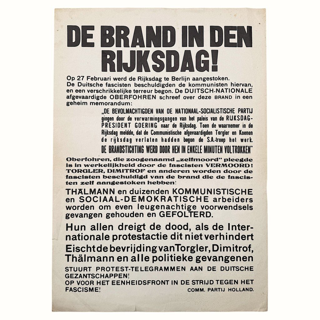 This rare propaganda poster from the Communist Party of Holland (CPH) was issued shortly after the Reichstag fire of February 27, 1933, in Berlin.The historical poster accuses the German fascists of setting fire to the parliament and calls for international solidarity and protest against the persecution of communist and social-democratic workers.The text refers to the events surrounding Torgler, Dimitrov, and Thรคlmann, who were falsely accused and imprisoned by the Nazi regime.The poster is a powerful example of revolutionary rhetoric and resistance communication from the early 1930s, just before the German occupation.The piece is in good condition, showing only light signs of age.Dimensions: 61 x 43 cmA remarkable and historic poster, perfect for a collection focused on political propaganda, communist movements, or the prelude to the Second World War.Article number: 16816Originele 1933 Communistische Partij Holland (CPH) poster RijksdagbrandDeze zeldzame propagandaposter van de Communistische Partij Holland (CPH), uitgegeven kort na de Rijksdagbrand van 27 februari 1933 in Berlijn.Deze historische poster klaagt de Duitse fascisten aan voor het in brand steken van het parlement en roept op tot internationale solidariteit en protest tegen de vervolging van communistische en sociaal-democratische arbeiders.De tekst verwijst naar de gebeurtenissen rond Torgler, Dimitrof en Thรคlmann, die door het nazi-regime ten onrechte werden beschuldigd en gevangengezet.De poster is een krachtig voorbeeld van de revolutionaire retoriek en verzetscommunicatie van de vroege jaren dertig, vlak voor de Duitse bezetting.Het affiche verkeert in goede staat met lichte ouderdomssporen.Afmetingen: 61 x 43 cmEen bijzondere poster, perfect voor een collectie rond politieke propaganda, communistische bewegingen of de aanloop naar de Tweede Wereldoorlog!