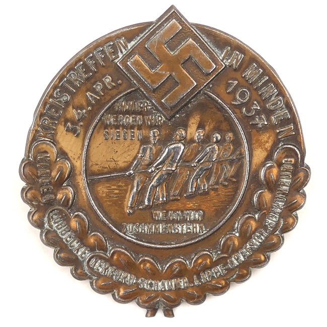 'Kreistreffen in Minden' 1937 Tinnie (Veranstaltungsabzeichen), this gathering was held on 3-4 April 1937 in Minden. The tinnie has a pin-back device to its hollow-back reverse. The tinnie is not visible maker marked. The tinnie is very lightweight, stamped from a thin metal sheet. Nice original early tinnie!