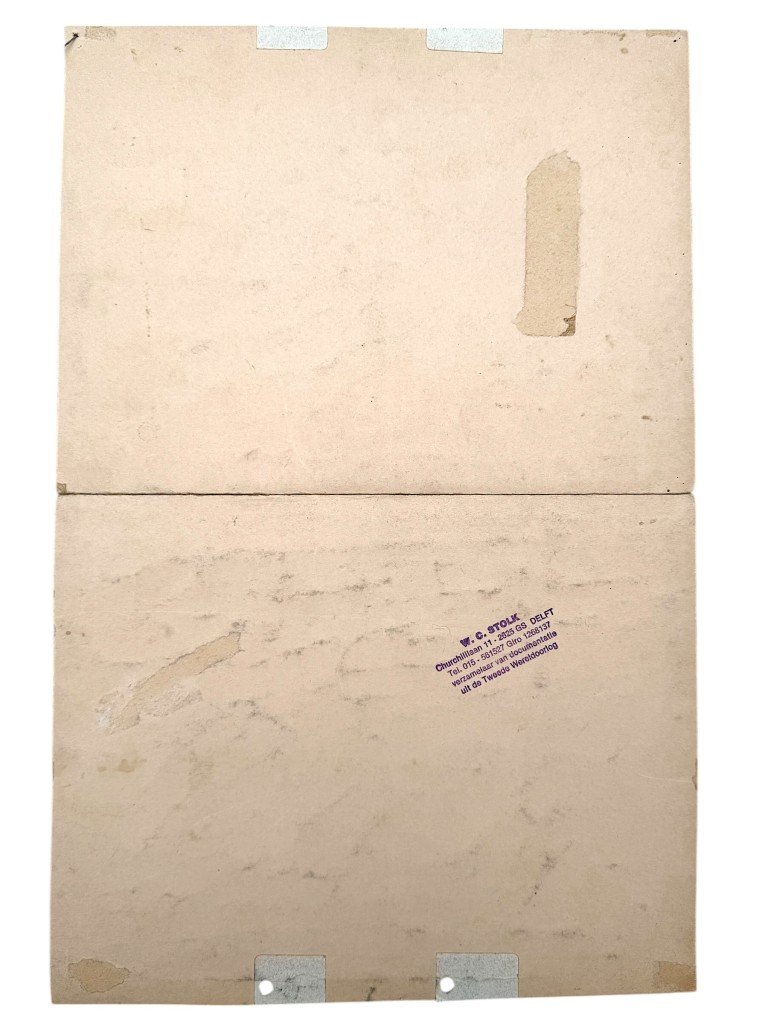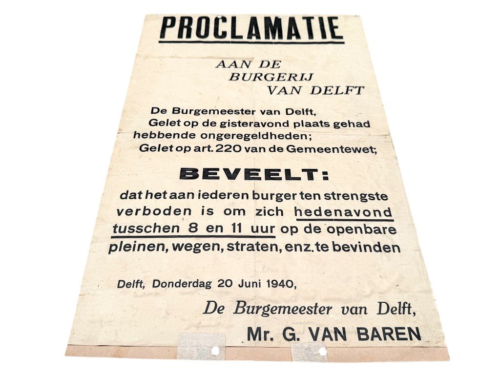 This Dutch proclamation poster addressed to the citizens of Delft dates from June 20, 1940, shortly after the beginning of the German occupation.The poster was issued by Mayor G. van Baren following disturbances that had taken place the previous evening.The text orders that citizens are strictly forbidden to be in public places between 8 and 11 p.m. that evening.Such proclamations were commonly used in the early months of the occupation to maintain order and prevent resistance.The poster is in good used condition with some signs of age.Dimensions: 44 x 29 cm.An interesting poster from the early occupation period of the Second World War!Article number: 16822Originele WWII Nederlandse proclamatie poster Delft 1940Deze Nederlandse proclamatie aan de burgerij van Delft poster dateert uit 20 juni 1940, kort na het begin van de Duitse bezetting.De poster werd uitgegeven door burgemeester G. van Baren naar aanleiding van ongeregeldheden die de avond ervoor hadden plaatsgevonden.In de tekst wordt bevolen dat het burgers ten strengste verboden is zich die avond tussen 8 en 11 uur op openbare plaatsen te bevinden.Dergelijke bekendmakingen werden in de eerste bezettingsmaanden vaak gebruikt om de orde te handhaven en verzet te voorkomen.De poster verkeert in goede, gebruikte conditie met enkele ouderdomssporen.Afmetingen: 44 x 29 cm.Een interessante poster uit de vroege bezettingsperiode van de Tweede Wereldoorlog!