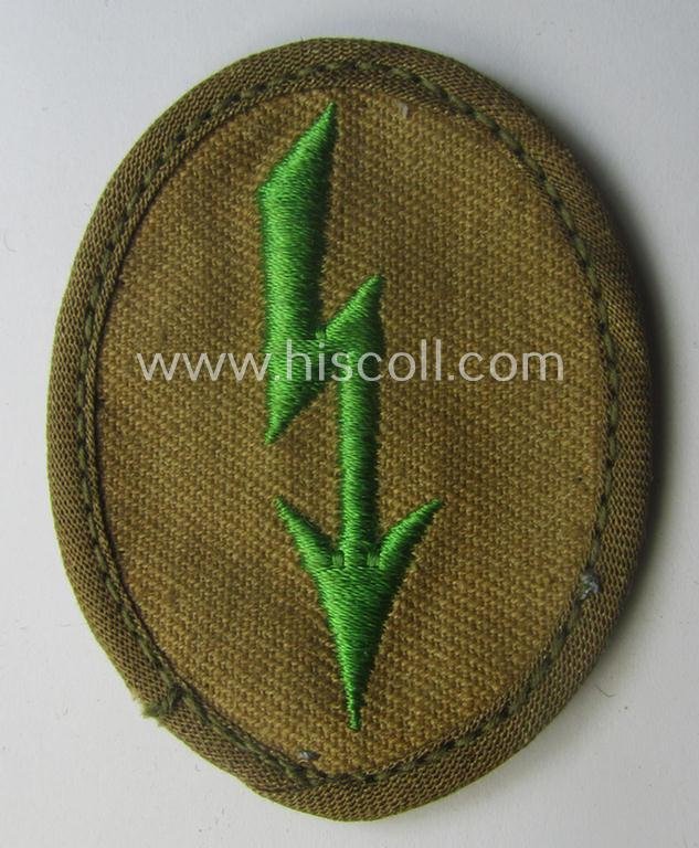 This is a neat WH (Heeres) 'tropical-styled', trade- and/or special-career insignia (or: 'Signal Blitz') as executed in machine-embroidered bright-green- (ie. 'hell- o. wiesengrΓΌner'-) coloured linnen as was intended for usage by a soldier (ie. NCO) who served within the: 'Panzer-Grenadier-Truppen' (or: simple soldier ie. NCO who served within one of infantry-related rifle-regiments) and that comes in an overall very nice- (ie.never used ie. 'virtually mint- ie. unissued'-), condition. The patch is a non-maker-marked example that shows a nicely reinforced border but is void of an additional backing: it does show some minimal age ie. staining simply caused by decades of storage only (as can be seen on the pictures). Simply a nice occasion to acquire a 'virtually mint', 'tropical-issue' ie. DAK- (or 'Deutsches Afrikakorps'-) related: 'Signal Blitz' as was intended for the: 'Panzer-Grenadier-Truppen'!