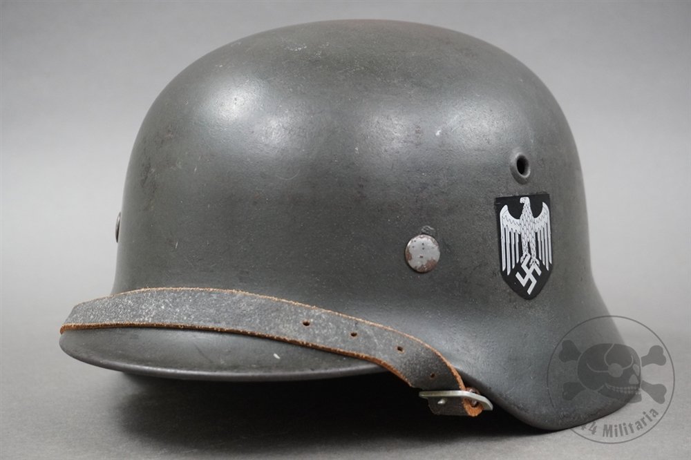 Original German WWII Refurbished Heer (Army) M40 Helmet Size 64-This is an original German WWII M40 helmet, manufactured by Eisenhüttenwerk Thale (ET) in size 64. It retains its original factory-applied dark field gray paint inside and out, with most of the wear concentrated on the top of the dome and only minor surface rust present.A high-quality reproduction dry transfer Heer (Army) decal has been correctly applied in the spot where the original once was but had been removed at some point. The helmet still features a high-quality European made reproduction reinforced aluminum liner band, dated 1940, fitted with a nicely aged, toned leather liner. Comes with original matching split pins and washers remain in place, though the split pins have lost all their paint.A reproduction leather chinstrap has been added, making this helmet an excellent choice for either display or reenacting.