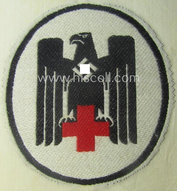 Neat - and actually scarcely encountered! - somewhat larger-sized DRK- (ie. 'Deutsches Rotes Kreuz'-) related sport-shirt emblem as was executed in the neat 'BeVo'-weave-pattern and that comes in a 'virtually mint' condition