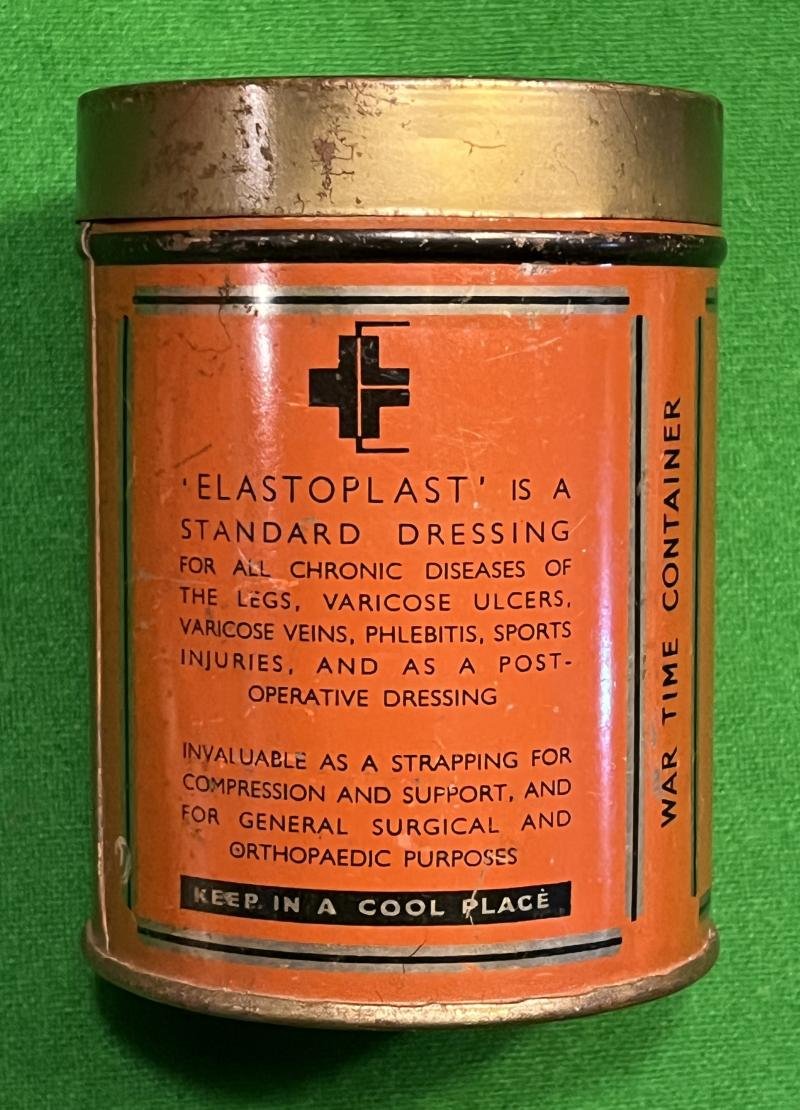 95mm tin for Elastoplast adhesive bandage with contents. Clearly marked ' WARTIME CONTAINER ' to indicate the decrease in quality in line with adherence to wartime restrictions on packaging. Tin in excellent condition with some very minor marking to finish complete with the classic ' spidering ' a typical indicator of wartime tin plate.