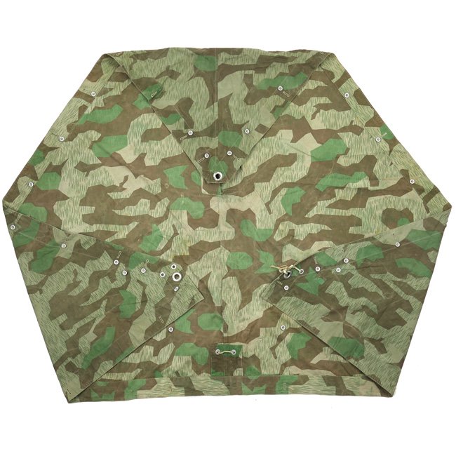 Luftwaffe M31 Shelter Quarter (Zeltbahn 31). The shelter quarter served buttoned together to form a four-man tent (or larger), it could also be worn as a poncho to give protection against rain, and it served as camouflage during a battle. It is made of tightly woven cotton drill with the 'splitter pattern' camouflage, which showed light colors on one side and dark colors on the other. This example is still showing bright colours. The shelter quarter looks to be complete with most of its aluminum dish type buttons and eyelets, a few buttons are missing. The Zeltbahn is nicely maker marked by the company of 'Anton Jöring' from Berlin and dated 1938, it showing a nice Luftwaffe issue marking 'L.B.A.Bt.38' (Luftwaffe Beschaffungs Amt) indicating issue in 1938. It is showing normal traces of usage, some staining and small repairs caused by usage, see photos. Nice original pre-war Luftwaffe issue Zeltbahn in very good condition!