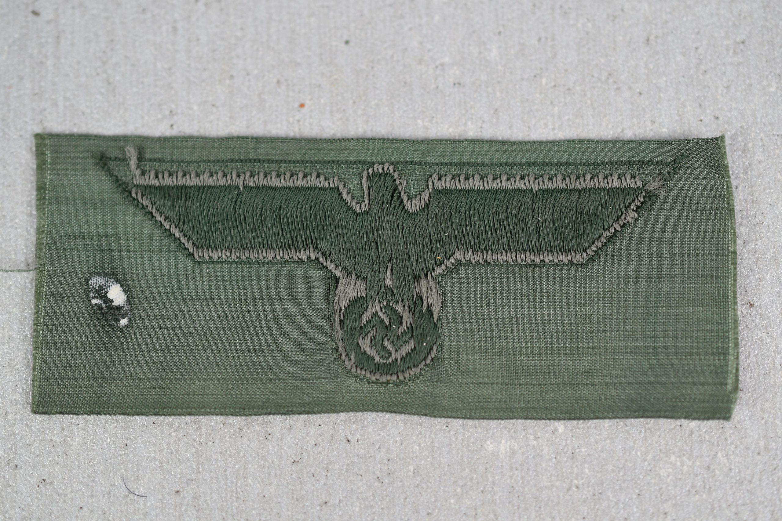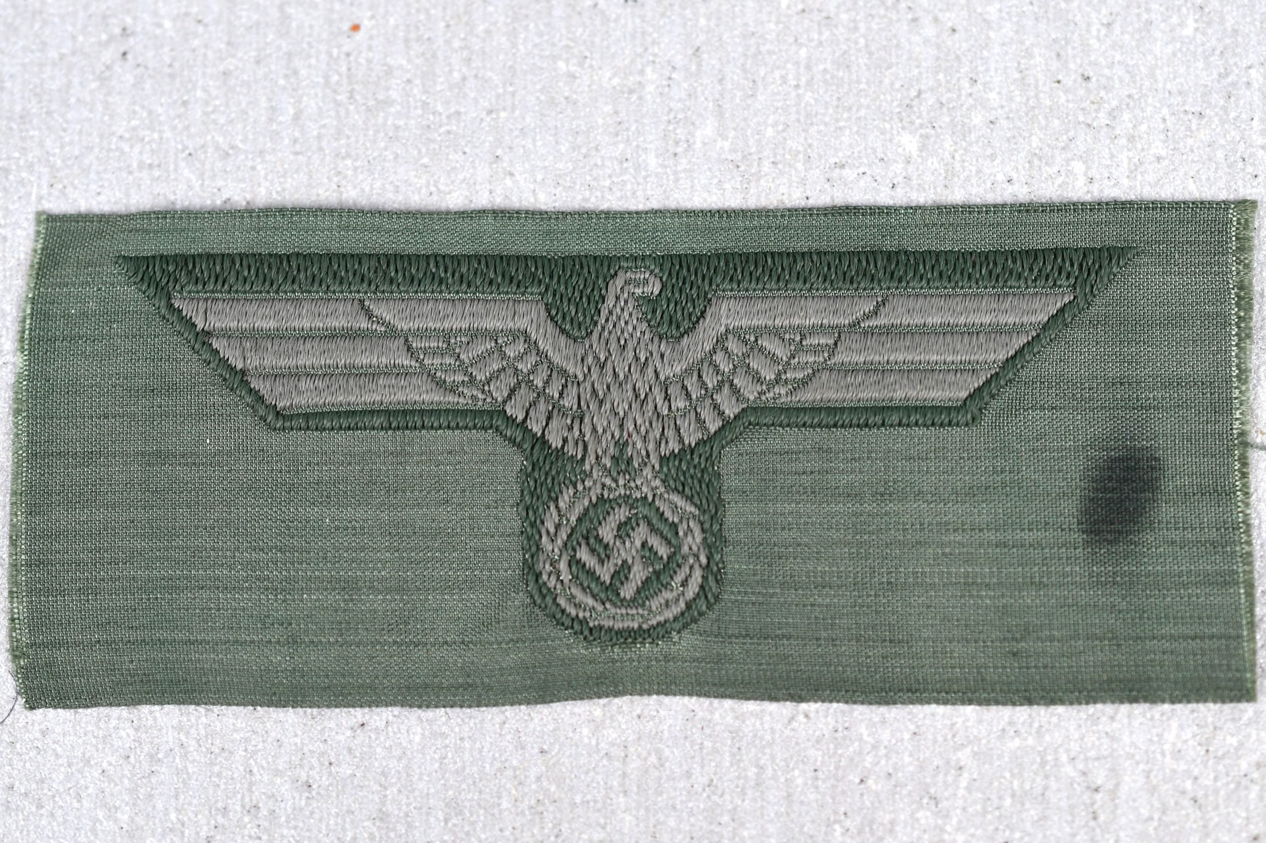 Standard M40 pattern flat woven BeVo-Weave (From the BeVo-Wuppertal cloth factory) cap eagle. Pale green example, issued in 1940. To be worn on a M34 pattern overseas-, M42-, or M43 army cap.