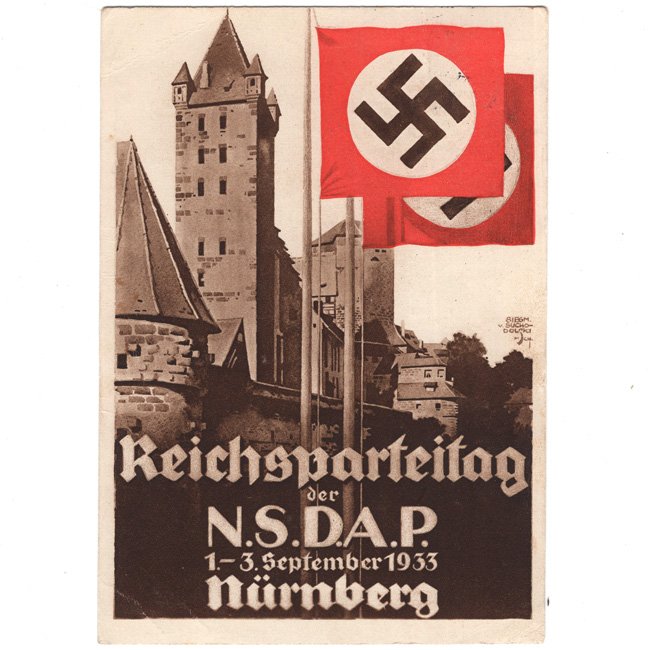 This is a nice original colour postcard of the 'Reichsparteitag der NSDAP - Nürnberg 1 - 3 September 1933'. The card was designed by 'Siegmund von Suchodolski' and shows the Nuremberg Castle (Nürnberger Burg) with swastika flags. This postcard was published by 'Verlag Franz Eher Nachfolger' from München. The card measures approximately 15 x 10,5 cm. in size and is in good used condition with minor damage to the corners, see scans. The card has been described on the back. Hard to find original postcard!