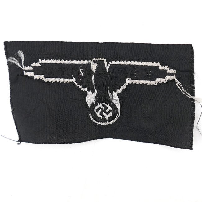 This is a nice Waffen-SS BeVo Sleeve Eagle (Γrmeladler). This machine woven version was introduced in 1939 and was to be worn by EM/NCO's on the various SS tunics (field-grey and camouflaged ones).The eagle is nicely machine-woven in the BeVo-weave pattern in silver-grey linnen on a black linnen background. The eagle is only a bit wrinkled and showing some minor damages caused by years of storage. Nice original sleeve eagle in mint and unissued condition!