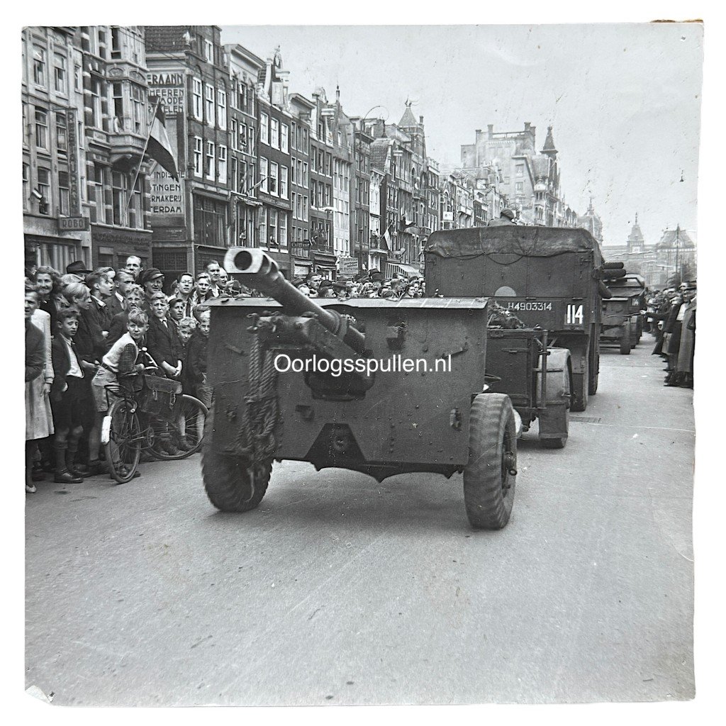 This Dutch photograph shows Allied troops entering Amsterdam in May 1945, shortly after the German capitulation.The image captures an Allied artillery piece with its towing vehicle moving through the crowded streets of the capital, as men, women, and children watch and cheer the liberators.Dimensions: 15 x 15 cm.A remarkable original photograph for collectors of Dutch Liberation 1945 photography or Allied military history.Article number: 16829Originele WWII Nederlandse bevrijdingsfoto Amsterdam mei 1945Deze Nederlandse foto toont geallieerde troepen tijdens hun intocht in Amsterdam in mei 1945, kort na de Duitse capitulatie.Op de foto is een geallieerd kanon met trekvoertuig te zien dat door de drukke straten van de hoofdstad rijdt, terwijl het publiek, mannen, vrouwen en kinderen, massaal toekijkt en de bevrijders verwelkomt.Afmetingen: 15 x 15 cm.Een bijzondere origineel foto voor de verzamelaar van Nederlandse Bevrijding 1945 fotografie of Geallieerde militaire geschiedenis.