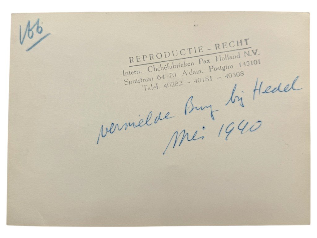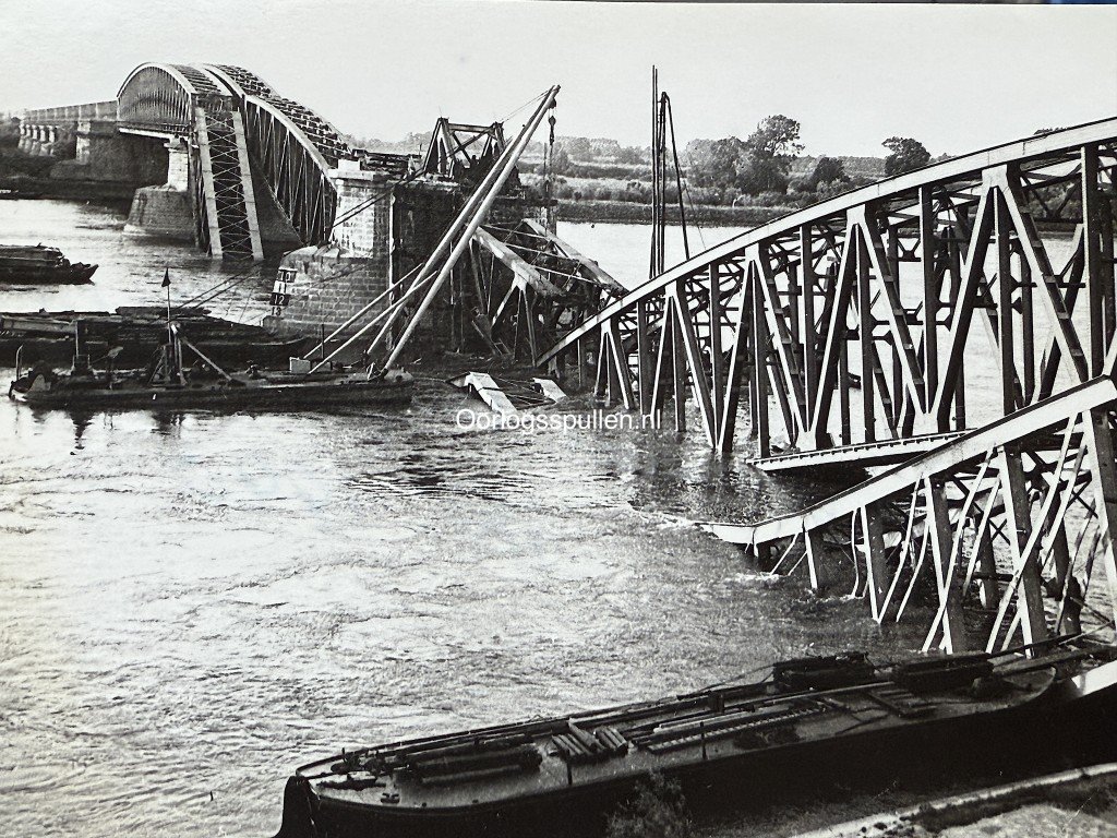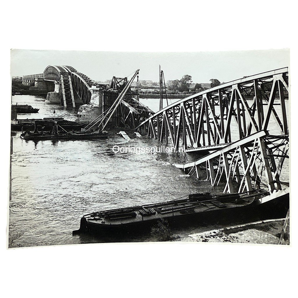 This Dutch photograph from May 1940 shows the destroyed bridge at Hedel following the German invasion of the Netherlands.The impressive image clearly depicts the damage to the bridge structure over the River Meuse, which was blown up by Dutch engineering units to delay the advance of German forces.In the foreground, several inland vessels and repair pontoons can be seen, and the photo was taken shortly after the destruction.Measurements: 18 x 13 cm.An interesting and historically significant photograph for collectors of Dutch World War II photography or military history.Article number: 16827Originele Mei 1940 Nederlandse foto van vernietigde brug bij HedelDeze Nederlandse foto uit mei 1940 toont de vernietigde brug bij Hedel na de Duitse inval in Nederland. De indrukwekkende opname laat duidelijk de schade zien aan de brugconstructie over de Maas, die door Nederlandse genie-eenheden werd opgeblazen om de opmars van de Duitse troepen te vertragen.Op de voorgrond zijn meerdere binnenvaartschepen en herstelpontons zichtbaar en de foto werd gemaakt kort na de verwoesting.Afmetingen: 18 x 13 cm.Een interessante foto voor de verzamelaar van Nederlandse Tweede Wereldoorlog fotografie of militaire geschiedenis.