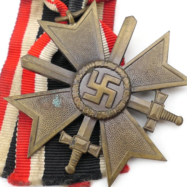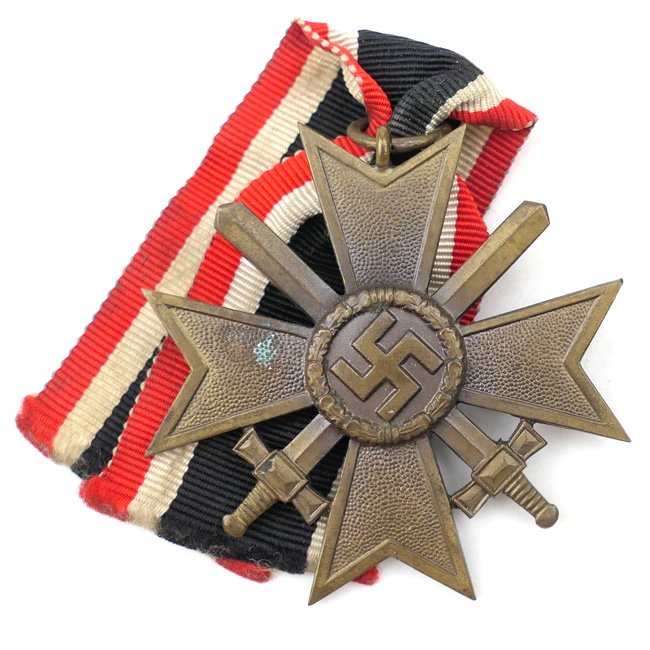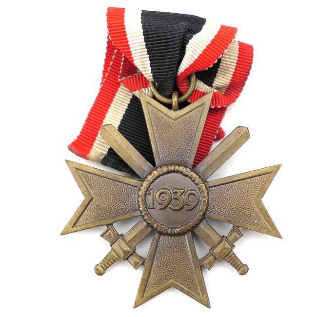 War Merit Cross 2nd Class with Swords (Kriegsverdienst Kreuz 2. Klasse mit Schwerter). The War Merit Cross was instituted by Adolf Hitler on 18 October 1939. The cross is a nice tombak example and comes with its original ribbon as found. The cross is not visible maker marked. Nice original cross in good condition!