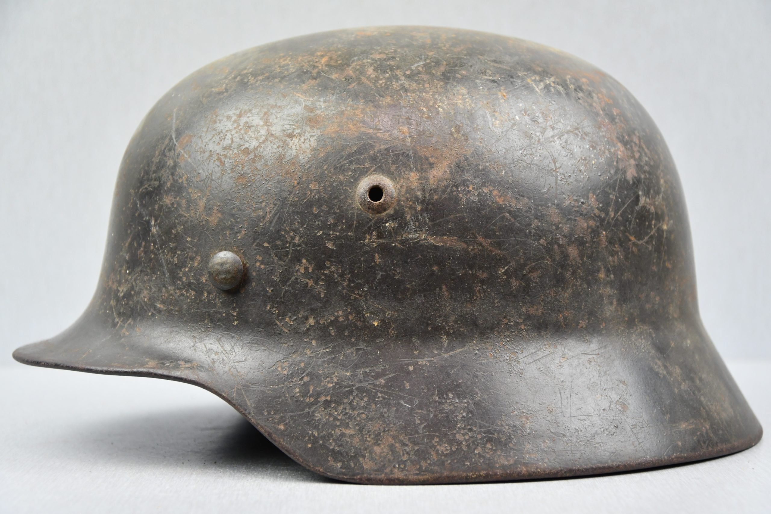 M35 blue colored Luftwaffe helmet with double decals. The Luftwaffe eagle is the desirable first pattern model often referred to as the 'Droop Tail' or 'Straight Leg' variant, typical for this manufacturer. Both decals are sadly almost complete gone due combat wear and a few percentages are left present. The helmet is complete with an aluminum liner (dated 1935). Original brass split pins present, washer missing. Most likely the liner was taken out at one point in time. The leather feels soft and remains strong. The liner shows the early size stamp pressed in the leather '66/59′. Maker marked by ET (Eisenhüttenwerk Thale) size 66 (ET66), lot number 2810. A very nice 'been there' combat worn Luftwaffe helmet!