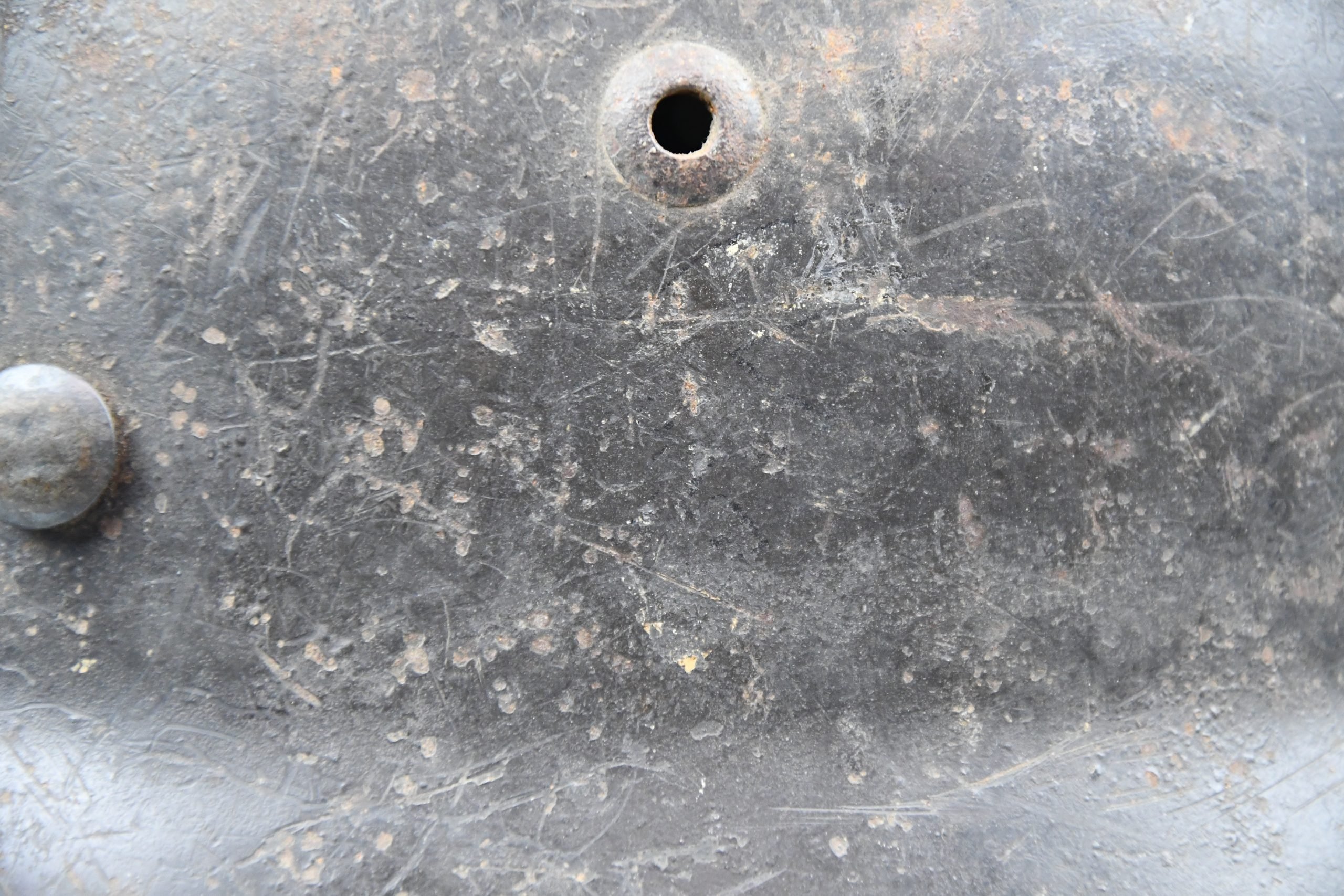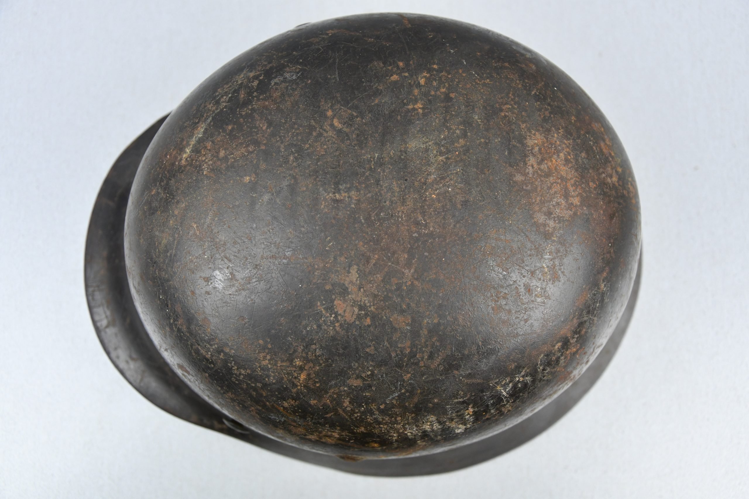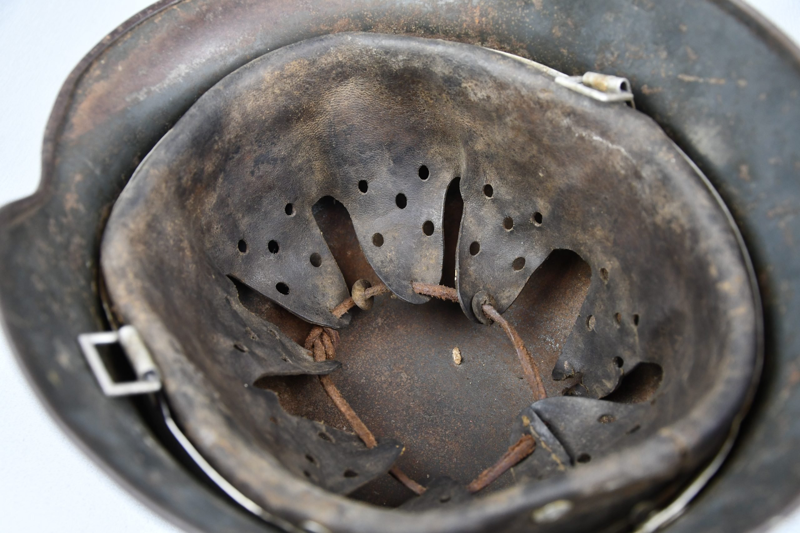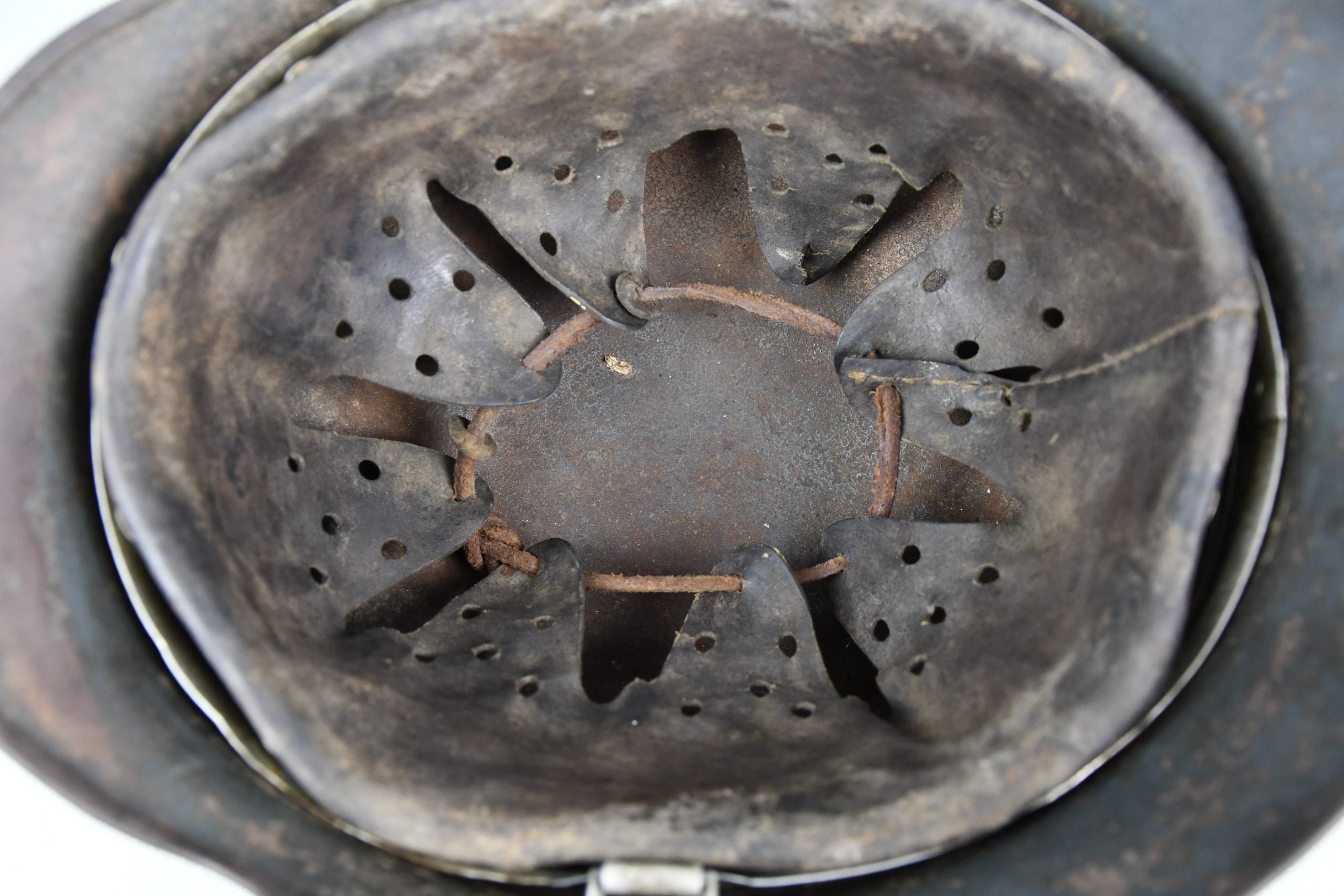 M35 blue colored Luftwaffe helmet with double decals. The Luftwaffe eagle is the desirable first pattern model often referred to as the 'Droop Tail' or 'Straight Leg' variant, typical for this manufacturer. Both decals are sadly almost complete gone due combat wear and a few percentages are left present. The helmet is complete with an aluminum liner (dated 1935). Original brass split pins present, washer missing. Most likely the liner was taken out at one point in time. The leather feels soft and remains strong. The liner shows the early size stamp pressed in the leather '66/59โฒ. Maker marked by ET (Eisenhรผttenwerk Thale) size 66 (ET66), lot number 2810. A very nice 'been there' combat worn Luftwaffe helmet!