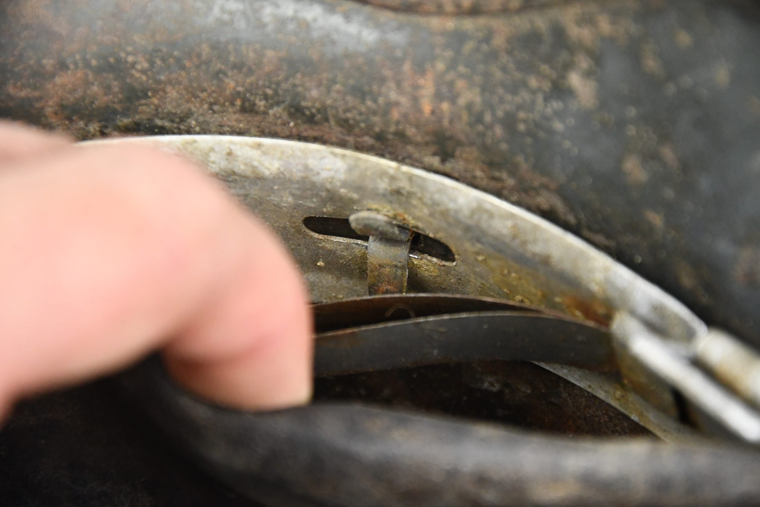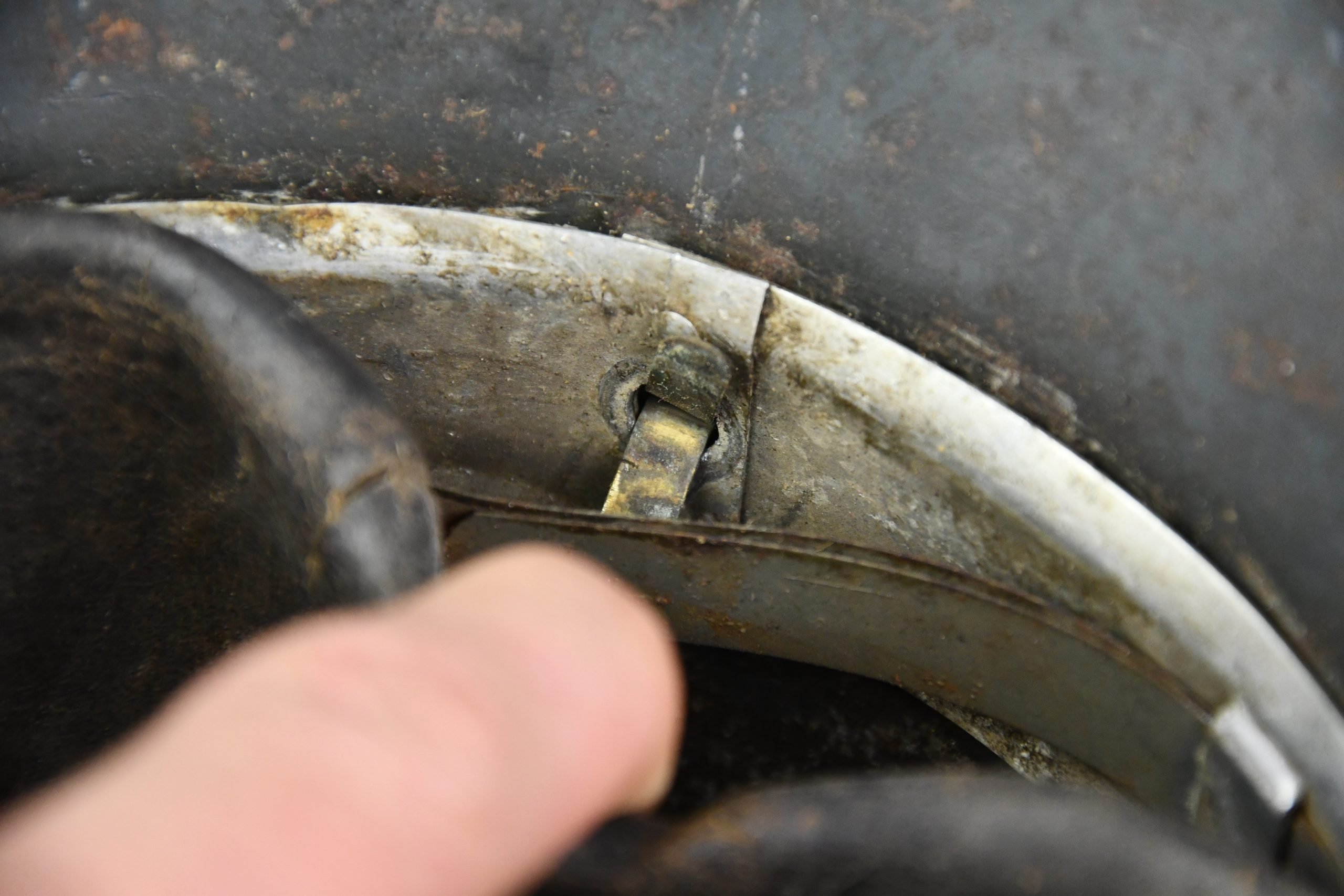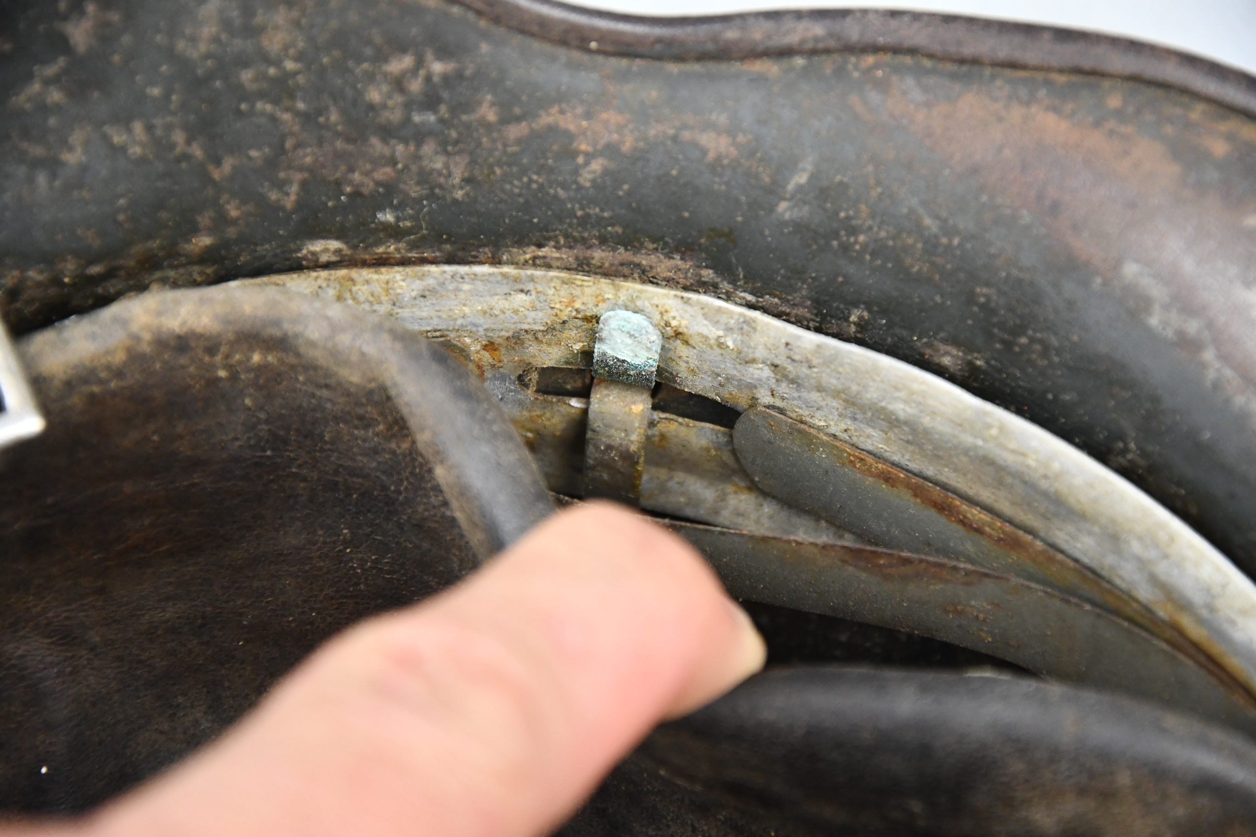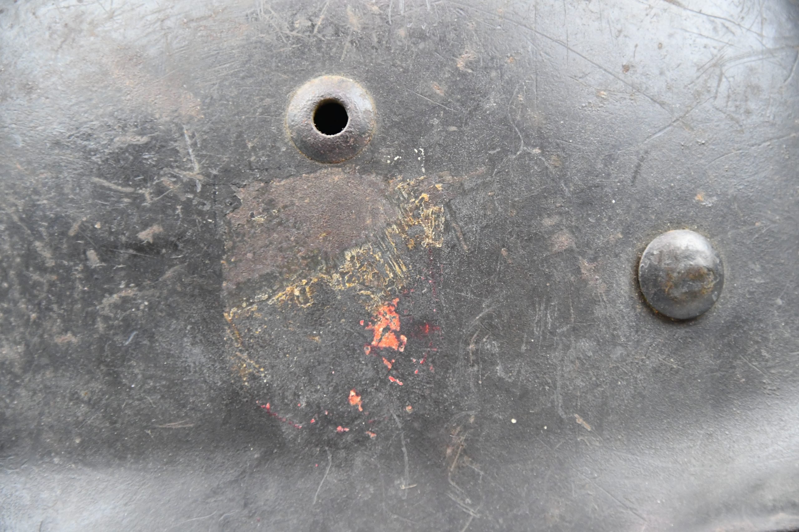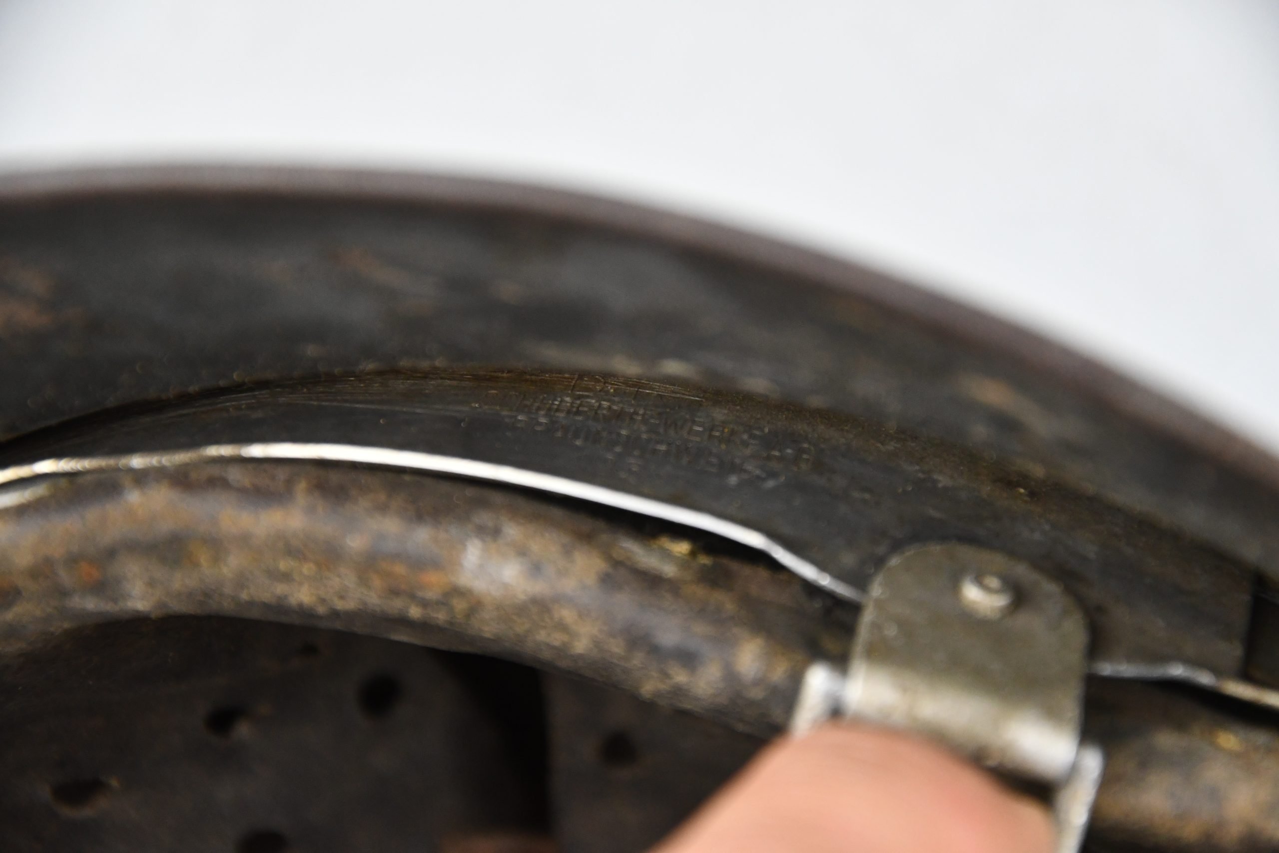 M35 blue colored Luftwaffe helmet with double decals. The Luftwaffe eagle is the desirable first pattern model often referred to as the 'Droop Tail' or 'Straight Leg' variant, typical for this manufacturer. Both decals are sadly almost complete gone due combat wear and a few percentages are left present. The helmet is complete with an aluminum liner (dated 1935). Original brass split pins present, washer missing. Most likely the liner was taken out at one point in time. The leather feels soft and remains strong. The liner shows the early size stamp pressed in the leather '66/59โฒ. Maker marked by ET (Eisenhรผttenwerk Thale) size 66 (ET66), lot number 2810. A very nice 'been there' combat worn Luftwaffe helmet!