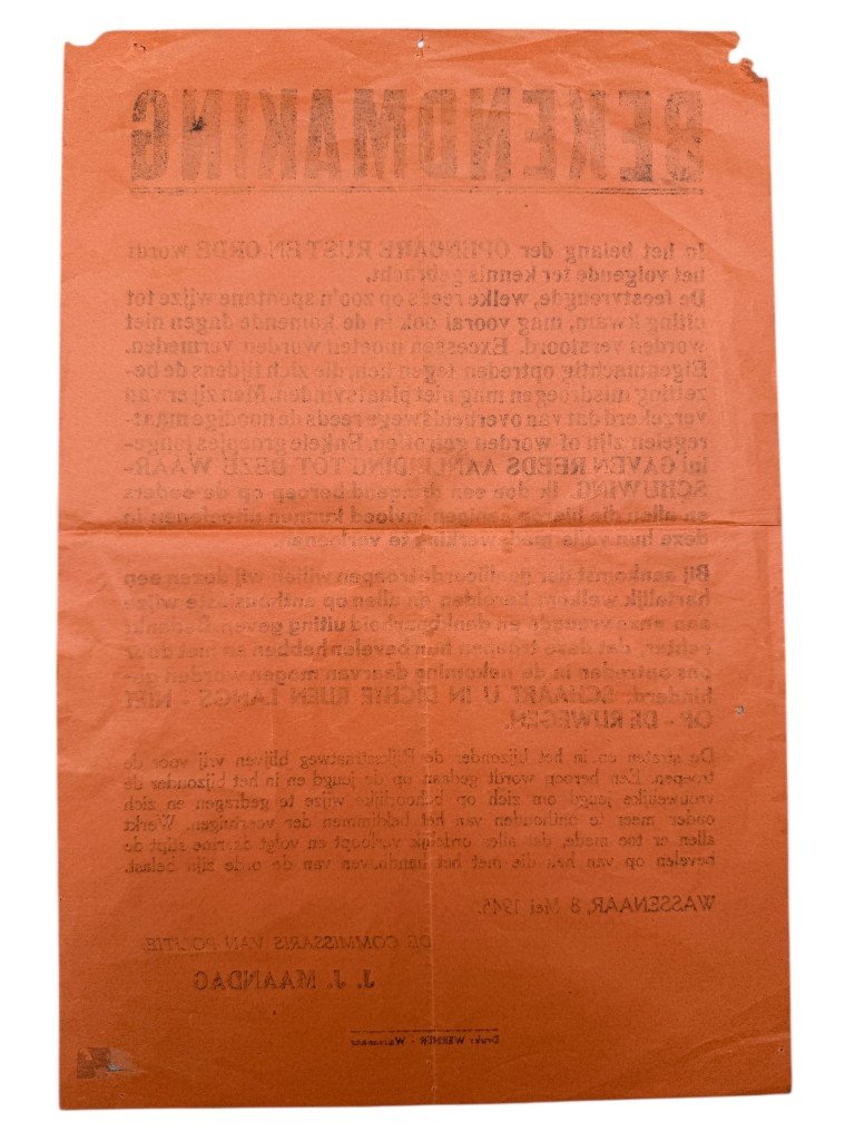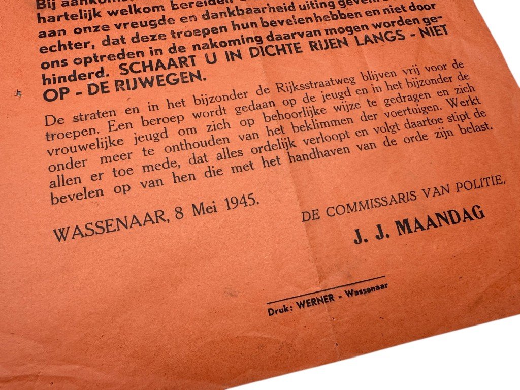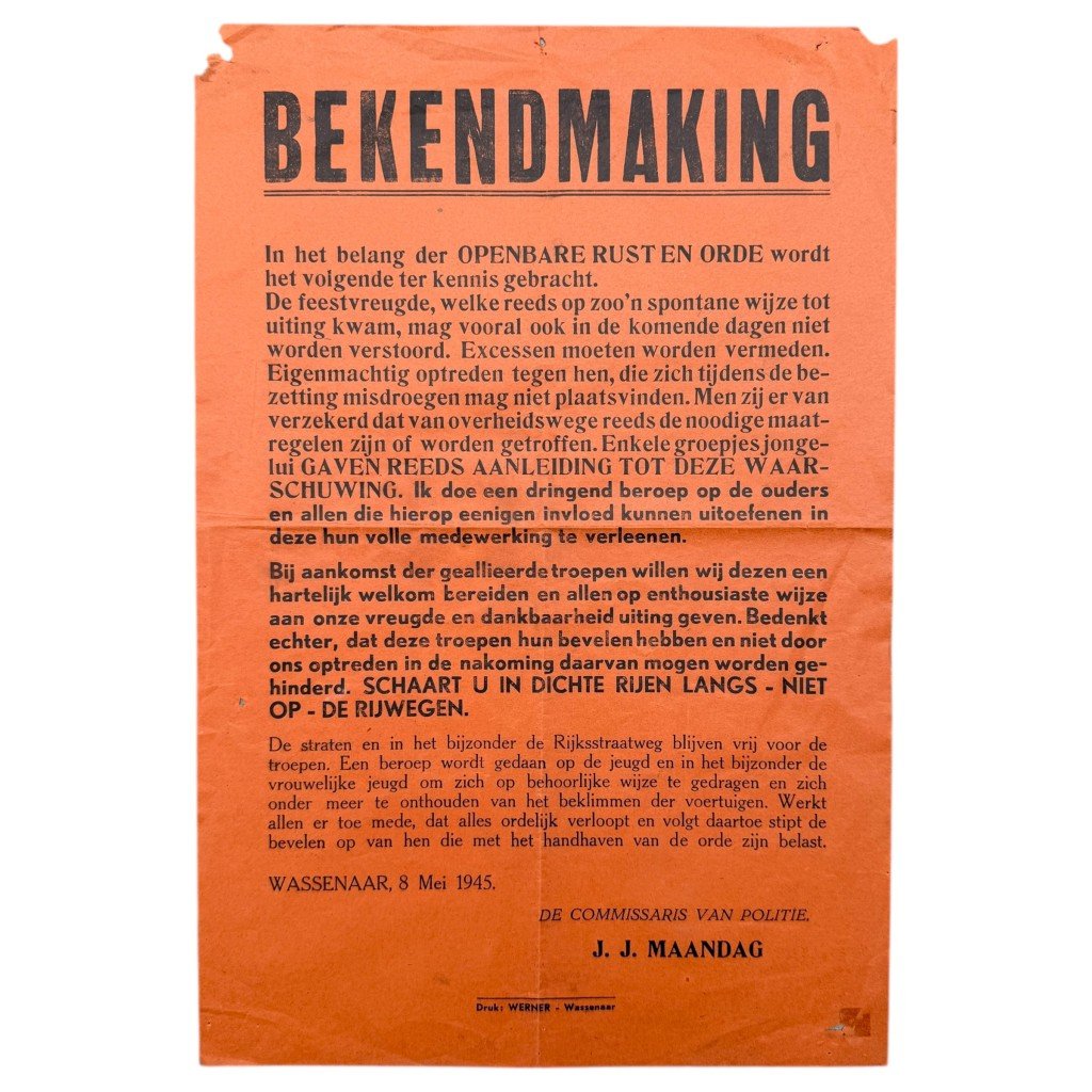 This Dutch announcement poster, dated May 8, 1945, was issued by the Police Commissioner of Wassenaar, J.J. Maandag, immediately after liberation.The striking orange 'Bekendmaking' calls on citizens to maintain peace and order during the celebrations welcoming the Allied troops.It emphasizes avoiding disorderly conduct and greeting the liberators in an organized manner.Dimensions: 40 x 27 cmArticle number: 16833Originele WWII Nederlandse mei 1945 bevrijdingsposter WassenaarDeze Nederlandse poster, gedateerd 8 mei 1945, werd uitgegeven door de Commissaris van Politie in Wassenaar, J.J. Maandag, vlak na de bevrijding.De opvallende oranje 'Bekendmaking' roept burgers op om orde en rust te bewaren tijdens de feestvreugde rondom de aankomst van de geallieerde troepen.Er wordt nadruk gelegd op het vermijden van excessen en het ordelijk verwelkomen van de bevrijders langs de wegen.Afmetingen: 40 x 27 cm