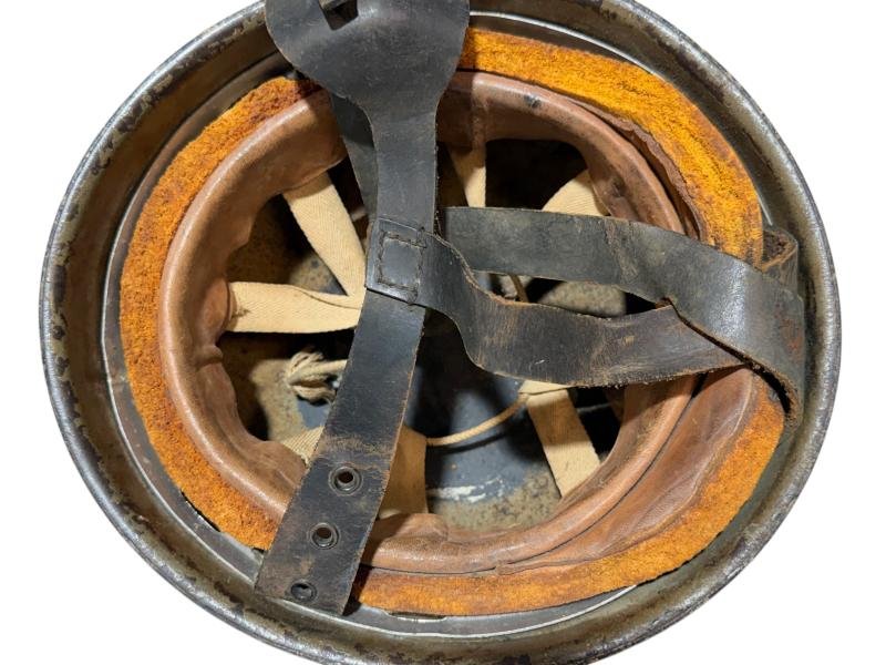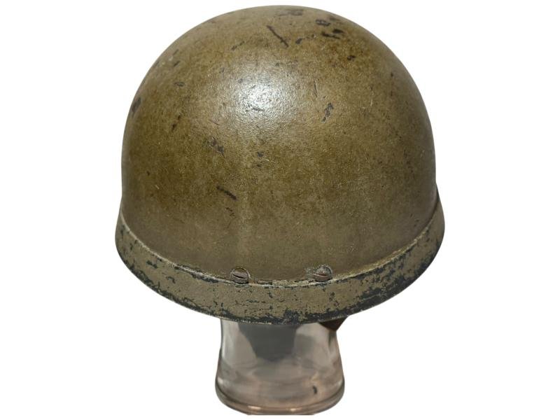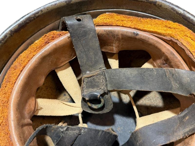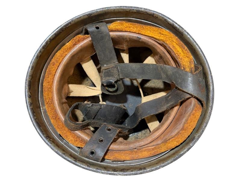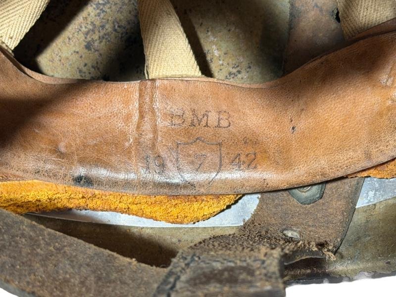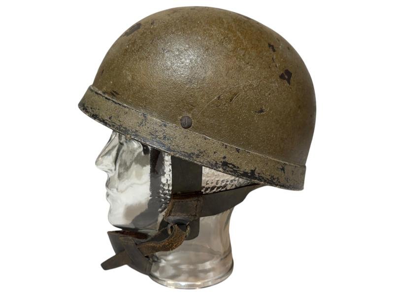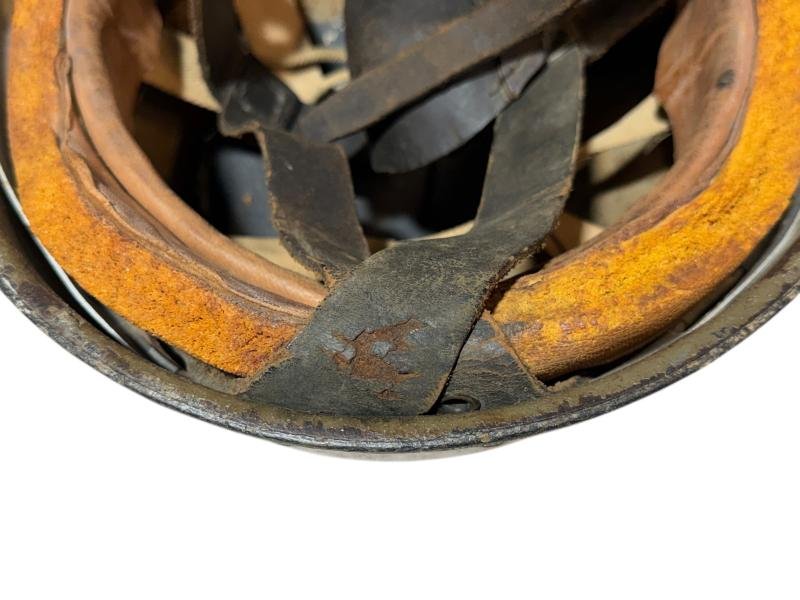 Really attractive British Fibre Rim Paratrooper Helmet.More then 95% of the original factory paint is still present and comes with the original leather chin straps and liner which is nicely maker marked, as well the date is clearly visible.
