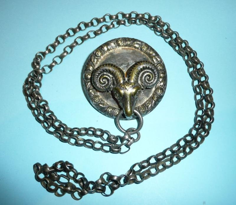 As worn on the shoulder belt, chain absent its whistle and keep. The Rams head whistle boss has its two fixing nuts to the reverse but appears to be on the incorrect backing disc. The correct pattern should have the words 'Simoor Rifles' on the the circlet, whereas this is mounted on the the universal pattern with decorative ornate scrolls and leaves. However, the the rams head on the disc appears to have been on it some time as the shape it has left on the underlying metal is clearly visible. Some wear to the silver plate on the 3D Rams head and horns. Sold as seen, no returns on this item.Comm EdBr
