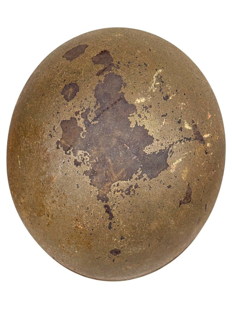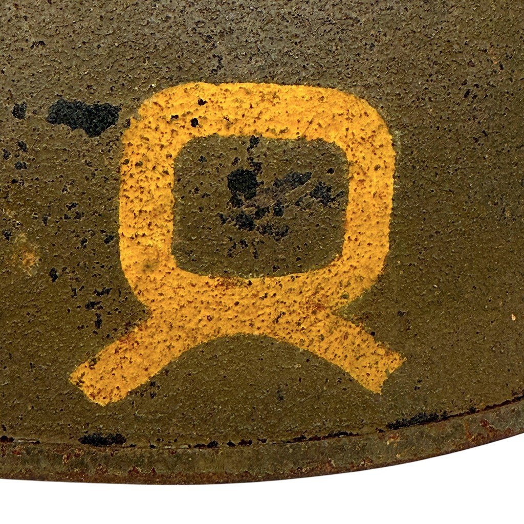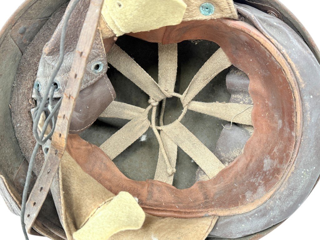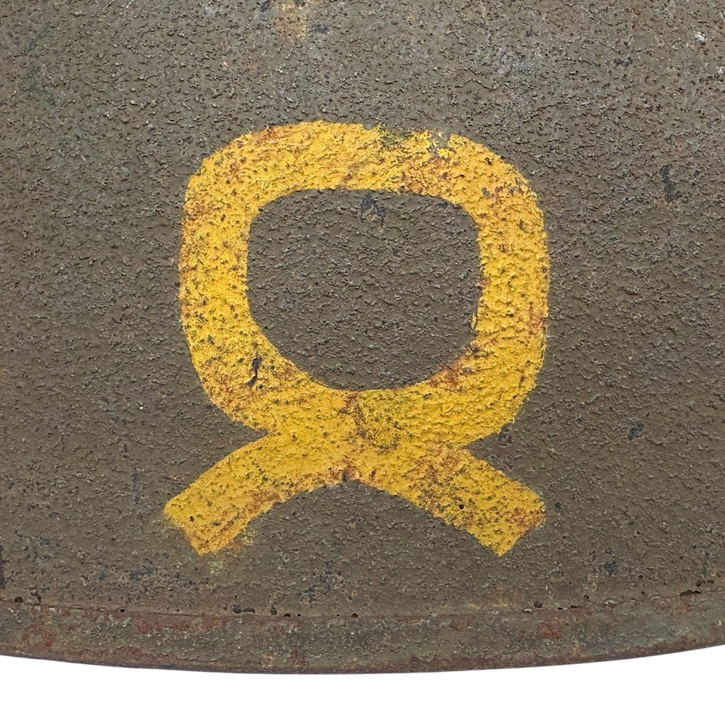 This British Dispatch Rider helmet from 1944 was manufactured by BMB (Briggs Motor Bodies) and was part of the equipment of a Royal Naval Volunteer Reserve (RNVR) Sub-Lieutenant.On both sides, yellow unit insignia have been hand-painted using gas detection paint, a special type of paint that changed color when exposed to poisonous gases.The helmet retains its original rough khaki-grey sand texture and shows clear signs of use, characteristic of genuine wartime service.The interior is complete with a leather liner, felt padding, and the typical webbing adjustment cord found on British motor helmets of that period.British wartime helmets featuring decals are generally harder to find!Article number: 16836